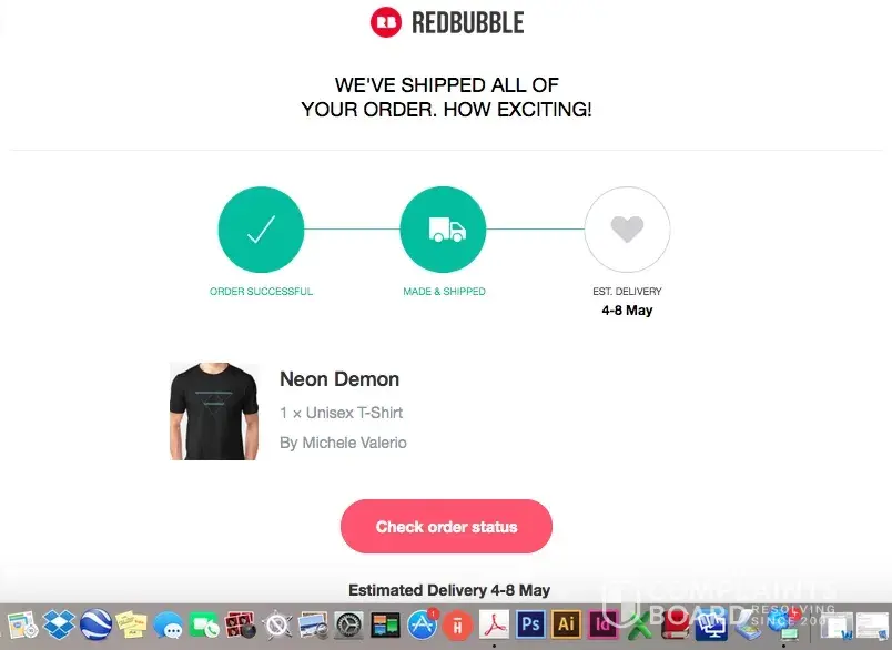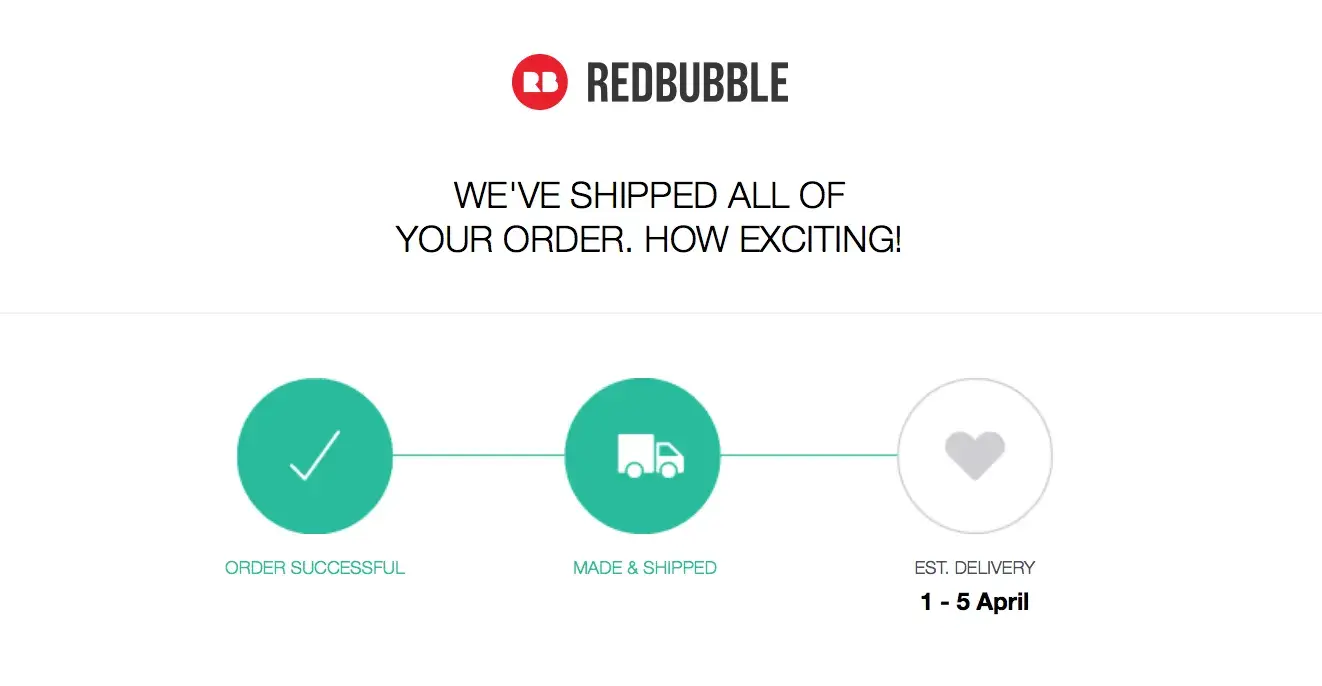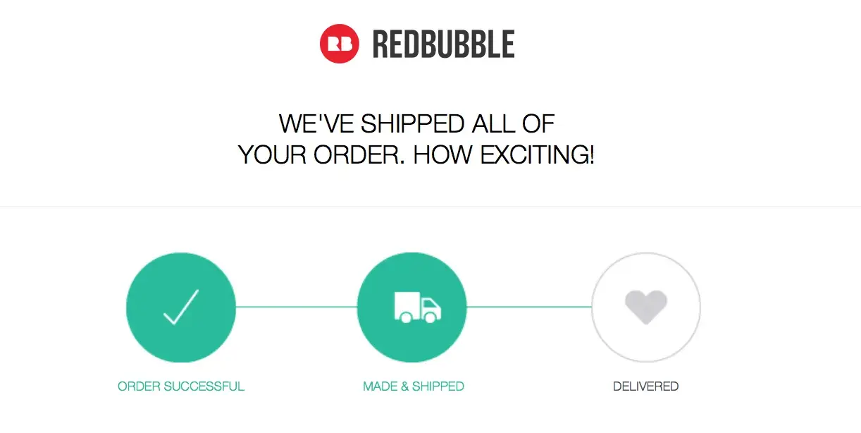 "Your Redbubble order has arrived"- Email dated 1/18/17 for a shirt ordered prior to Christmas. As of 2/28/17 this order was never delivered.