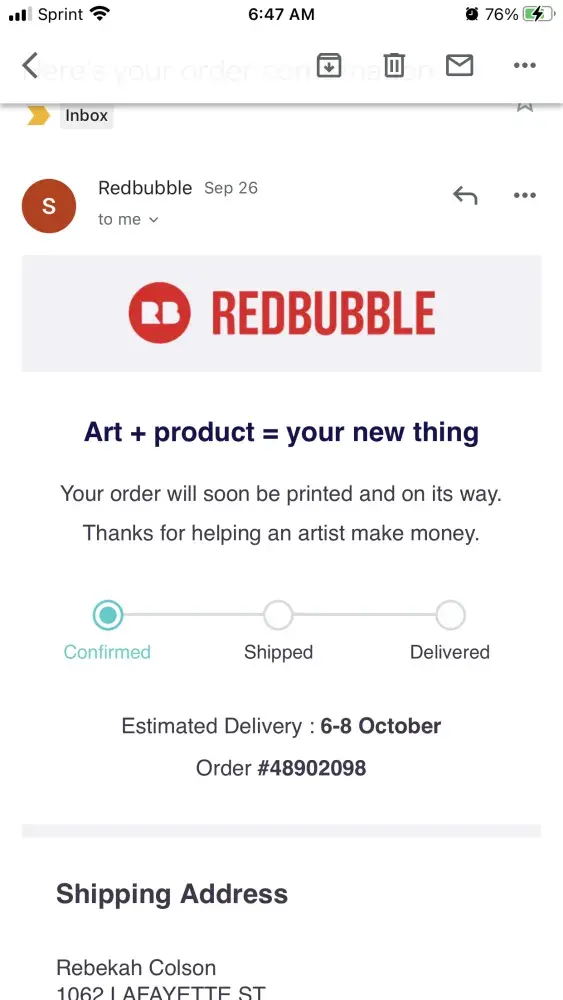 Order never arrived as stated in Redbubble email