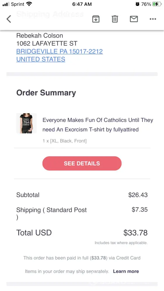 I finally thought to check with UPS again on the remainder of my purchase's whereabouts, only to learn that the expensive items now reside in a "dead mail" facility in Maryland. How and why that happened is anyone's guess--literally, since there's no way to contact Redbubble if the site can't locate your order. There is no one to ask, no one to help.