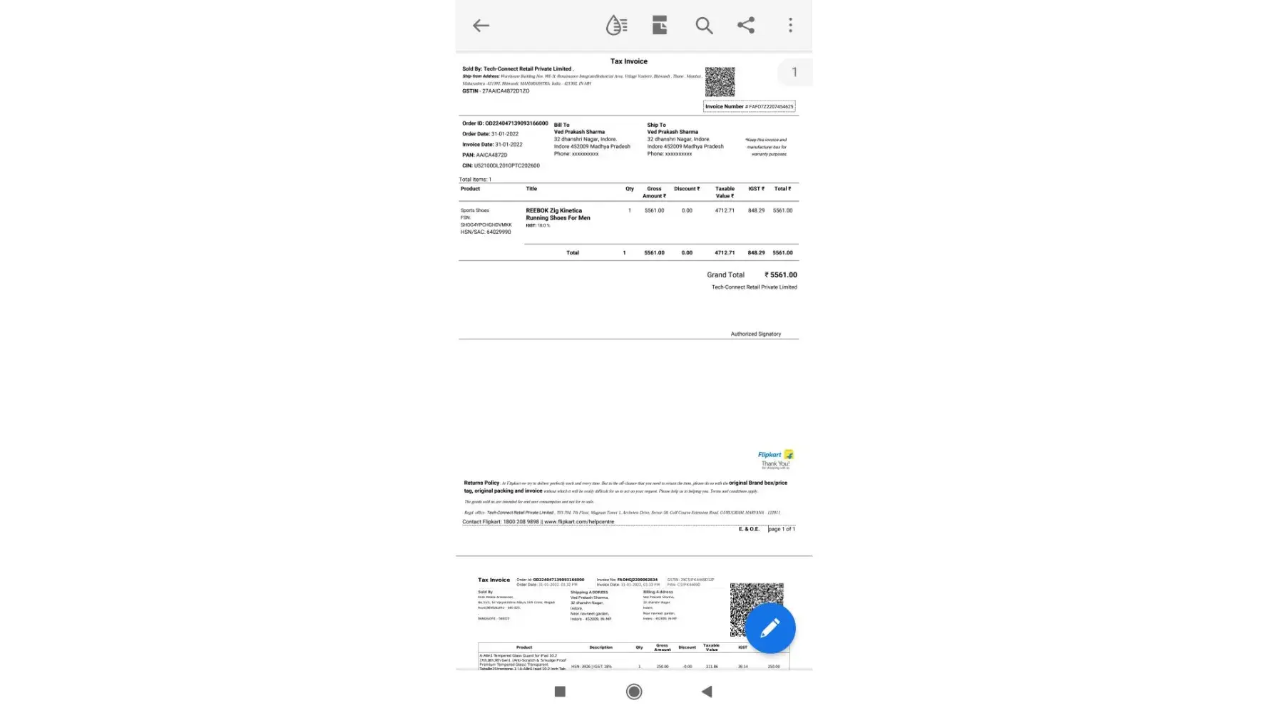 I have ordered "Reebok zig Kinetica running shoes for men" from Flipkart on 31/01/2022. After wearing for a month I started experiencing intense pain in my left leg. Initially I ignored the pain.But pain now remains permanent and I have to see a doctor. I couldn't return the product that time as return policy days were passed. Invoice is attached.