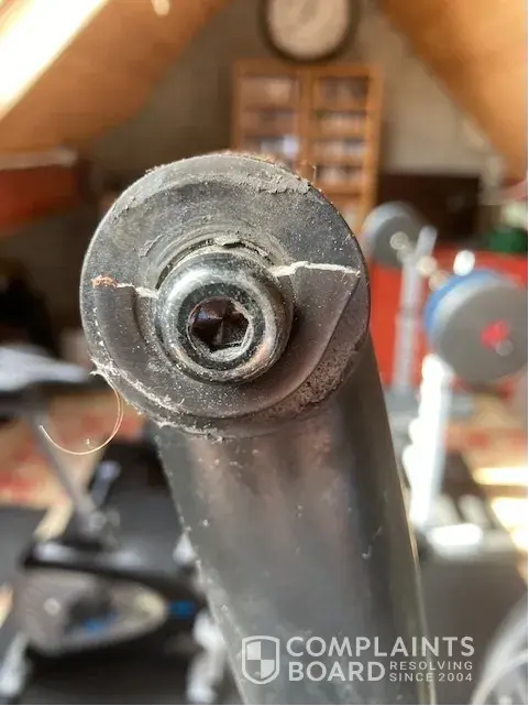 However, last week, when I was using the machine, it collapsed. The bracket on the right leg bar, (referenced as I-3 in the manual) completely fractured (see photo) this then came away breaking the plastic cover I-2. Thankfully I wasn't injured but quite easily could have been and I was disappointed that this should happen to a trusted quality brand.