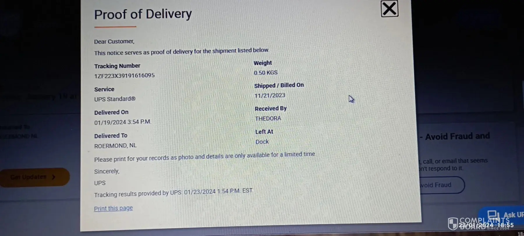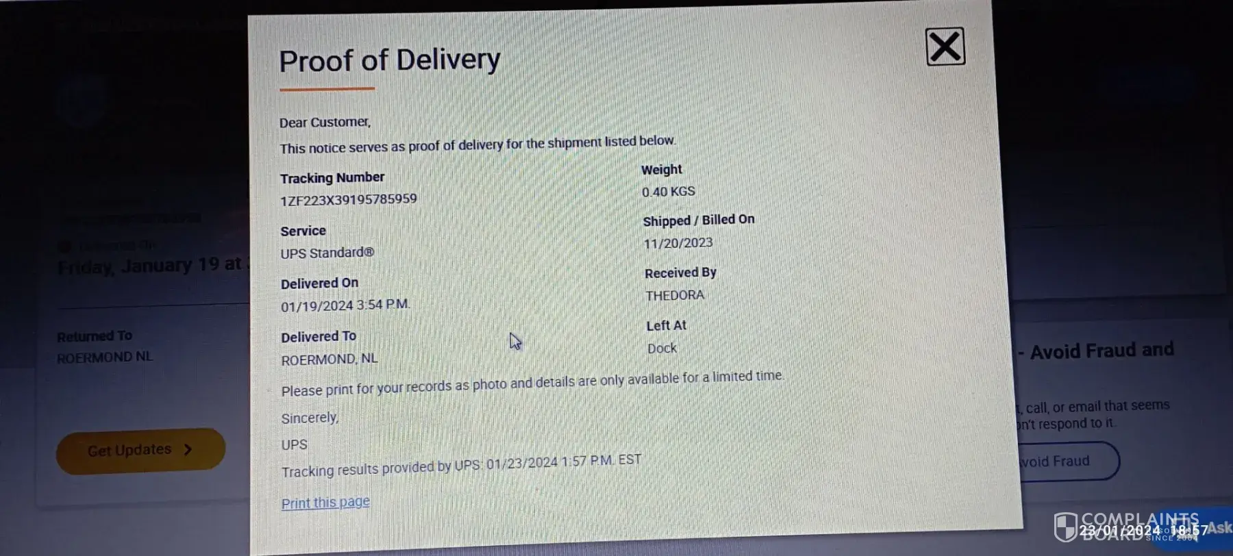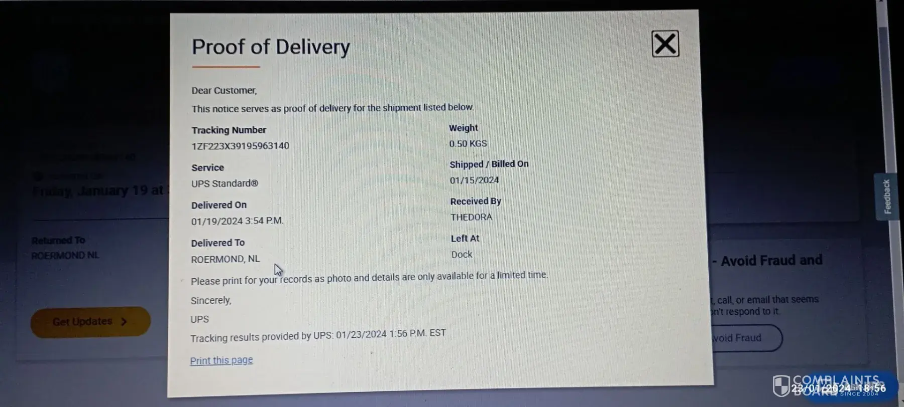 According to the UPC tracking numbers and carrier, I received confirmation that three of my returned orders had been delivered to Reebok and were received and confirmed by an employee.
