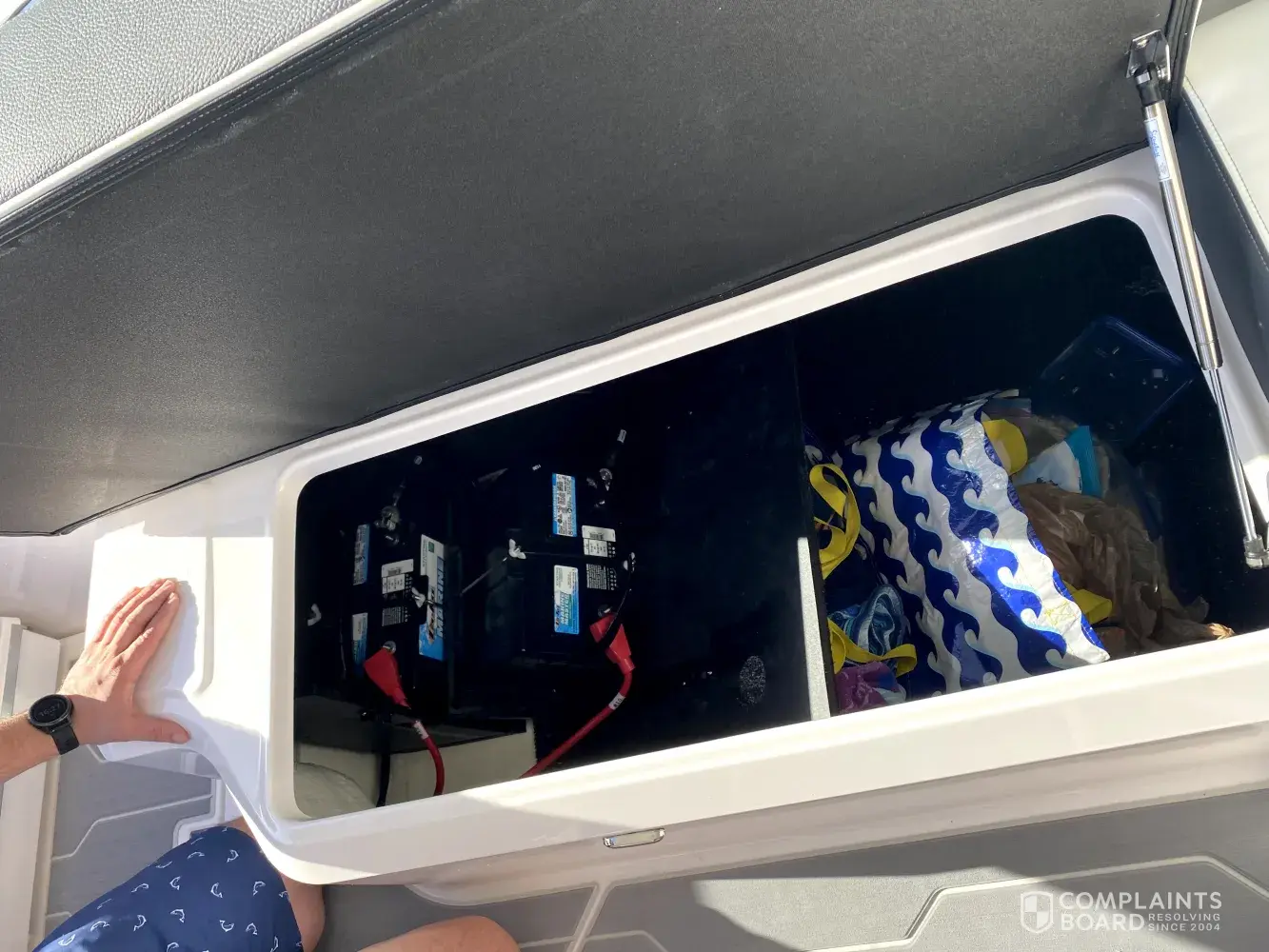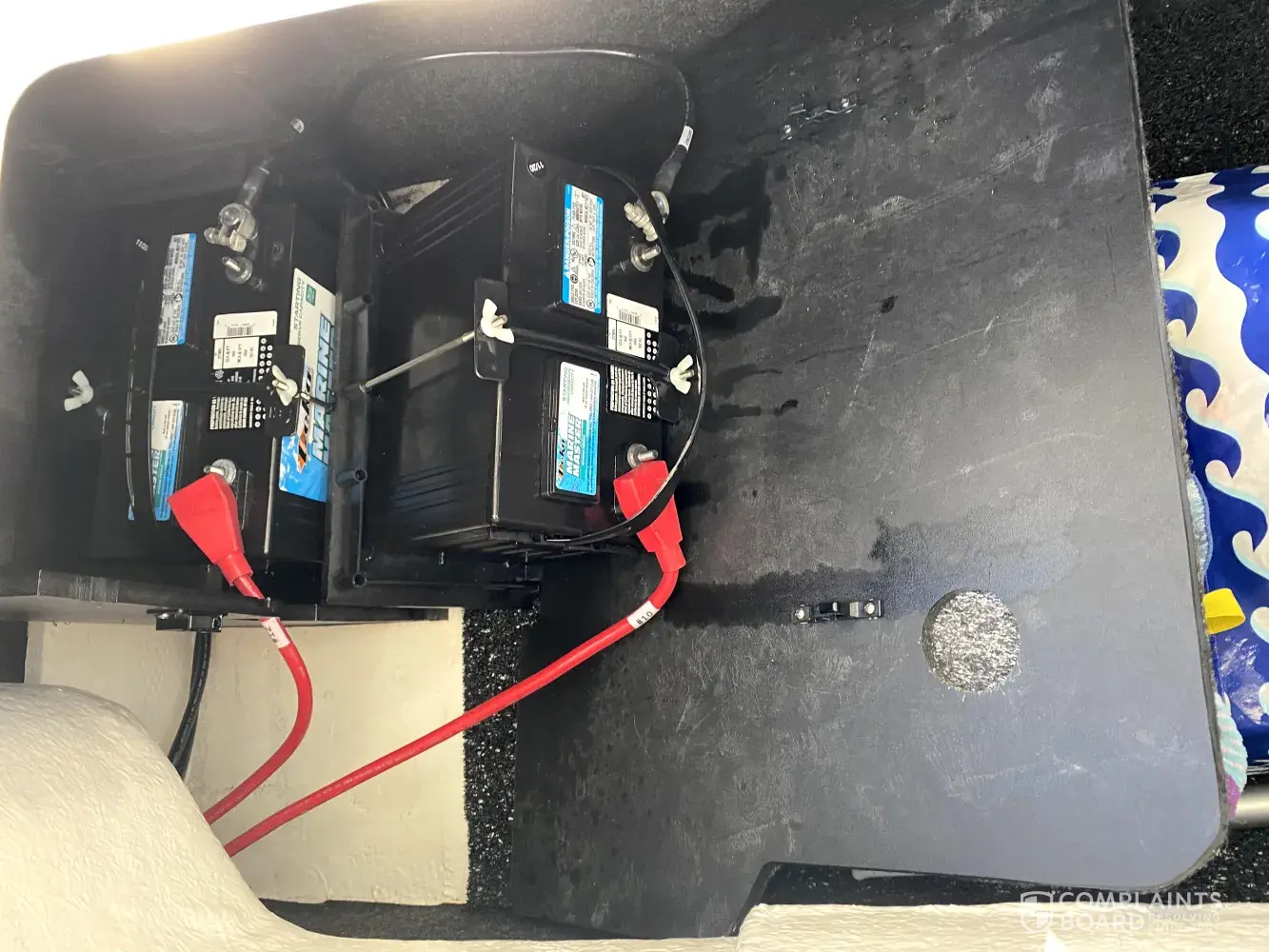 On our maiden voyage 02/27/21 when we reached our intended destination we opened the storage compartment on the Port Side Main Cockpit seating area only to find the Battery was toppled over on its side . After assessing how to secure the battery from a potential fire hazard and explosion we returned to port. On Monday I took the boat to the dealership for this problem and several others that will be mentioned later depending on the outcome of those repairs. While at the dealership I asked specifically whose responsibility is to secure that battery and what is the safety design to keep it from falling off the shelf it is mounted on. No answer was provided at that time. I then contacted Customer service at Regal directly on Monday the 1st of March and received a reply that Engineering had not gotten a response to them. I then contacted Wednesday yet again another representative from Regal customer service to which that response is also in line with Engineering not getting back to them as well. I cannot conceive how a manufacturer such as Regal with Engineers and designers on call cannot have a response. Is it a design flaw where no restraint has been designed into the battery tray and I am the first to realize it. In all fairness there is a barrier that is placed in front of both batteries that using pressure pins holds itself in place so that the storage compartment is separated from the batteries. See Photos. These pressure pins release with the slightest amount of force so that the user can access the batteries if needed. However there is nothing holding the top battery from falling over as mine did.