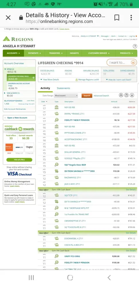 Ian an Eagle in bookkeeping, I have been with Regions Bank for 3 years now. But I find very strange and unusual activity going on within the ranks of accounts. But multiple times My bank account has come up depleted.Every transaction I did, was recorded. But somehow my bank account is still being depleted. I think that this kind of activity, needs to be investigated. Hopefully not a another Wells Fargo deal.