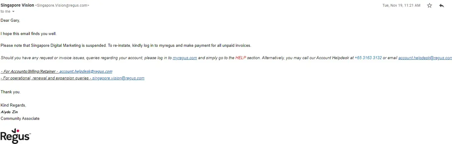 Regus is a thug company, and their account helpdesk is misleading and very unprofessional.