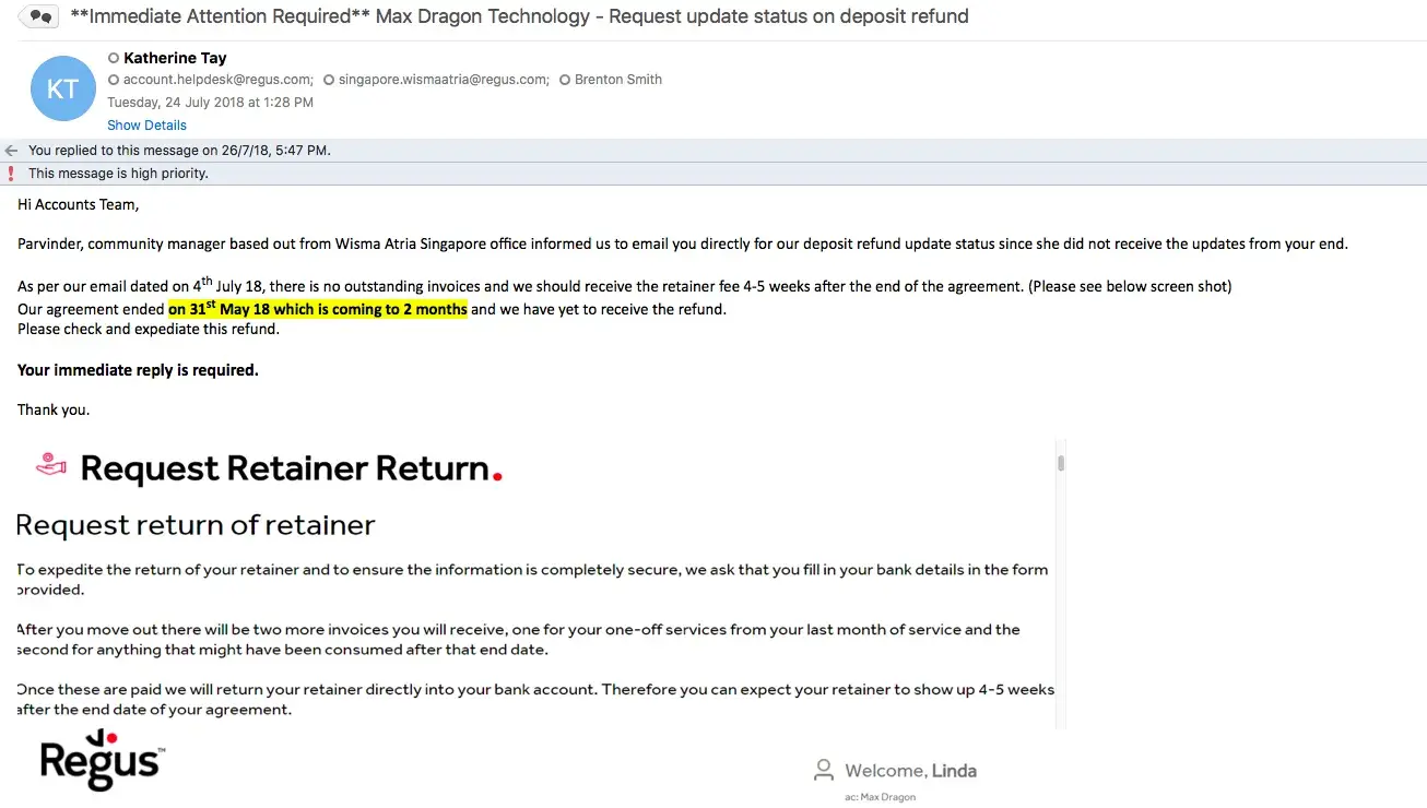 1. There was no mention of a security deposit when Regus presented our new contract in May, either in writing or verbally;