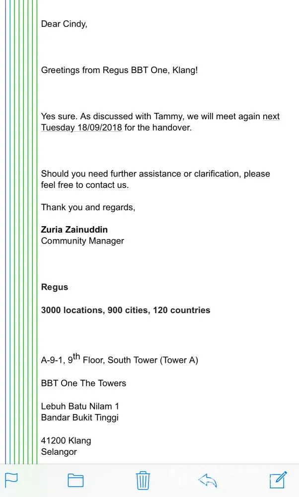 Regus global which prides itself in promoting the brightest talents but unfortunately when your handle this issues yet the first question I would like to asks when we raise this issues to your if this is the correct manner handle by your so called intelligence talents which they promises to granted us the access till 18th for handover but denied and ignored our request and right again?