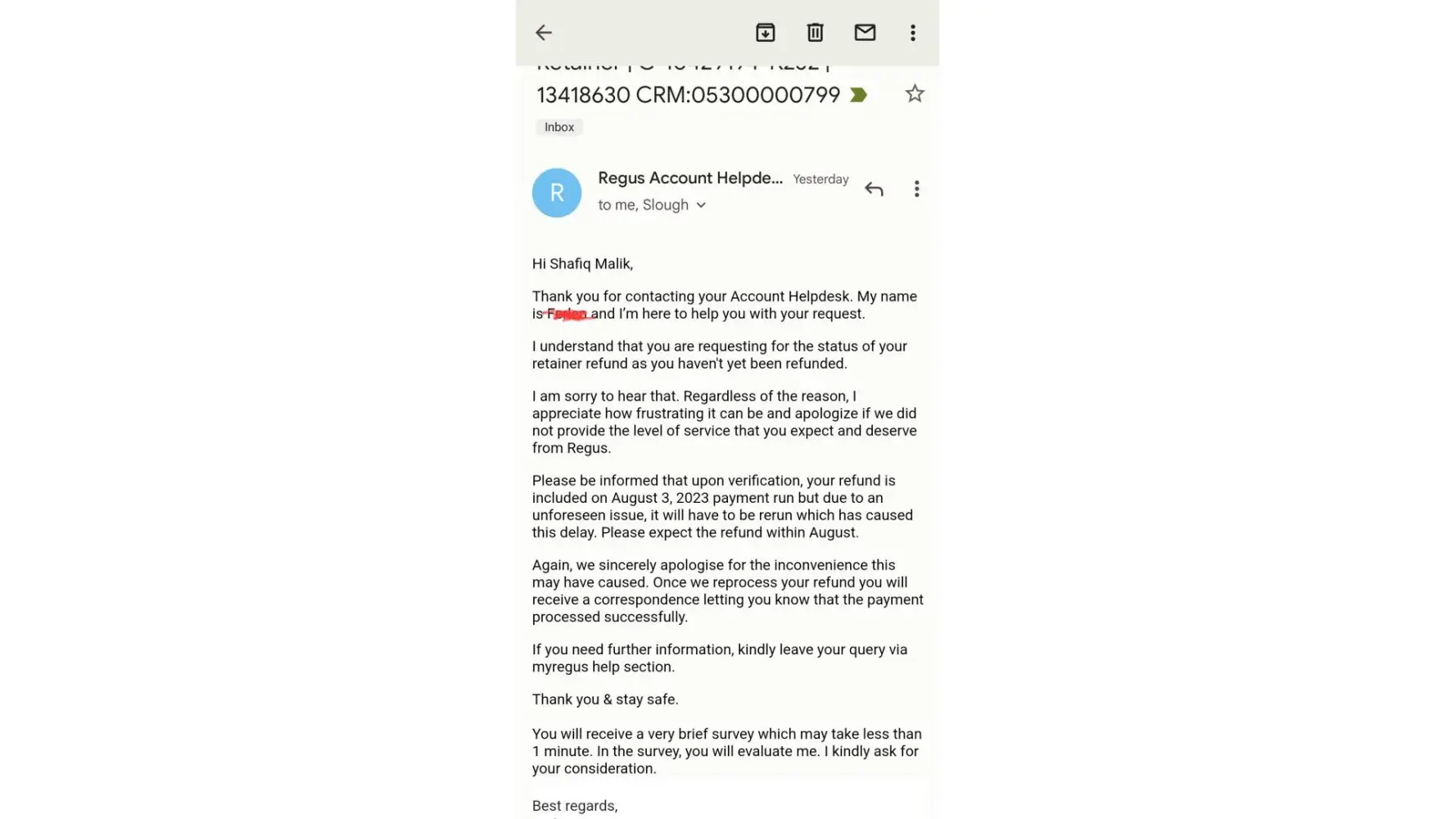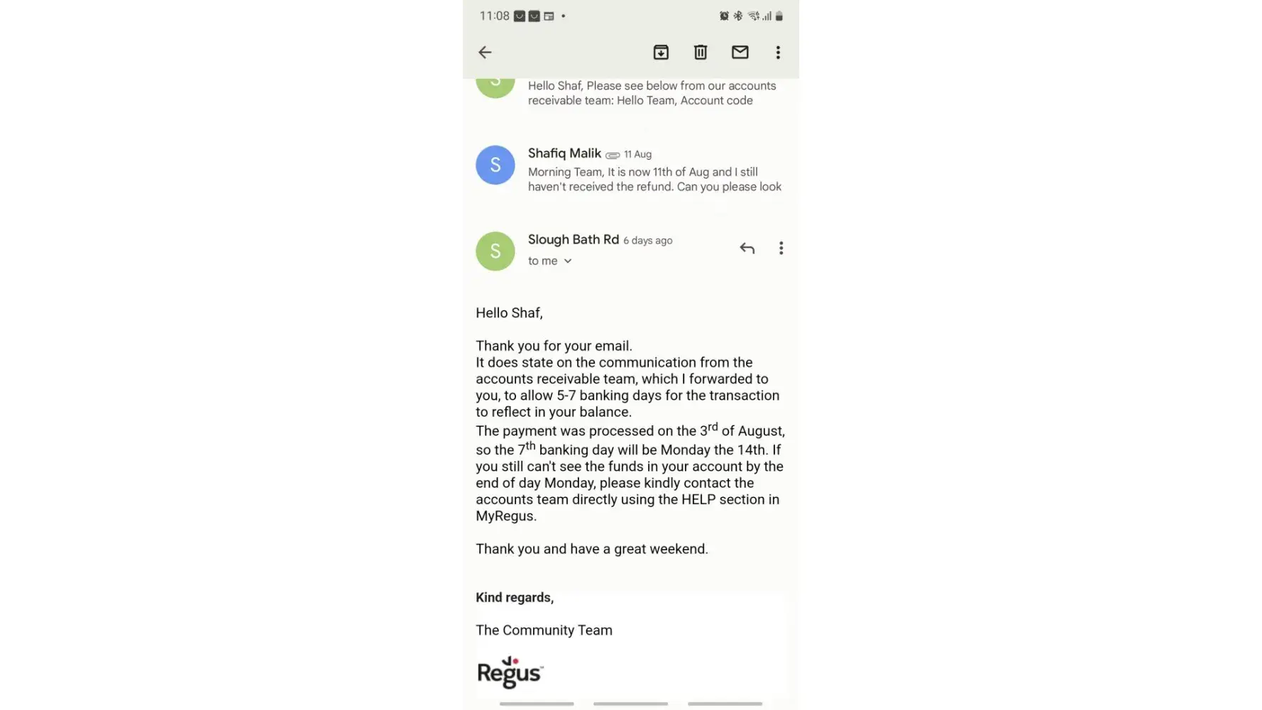 Further exchange with Regus: