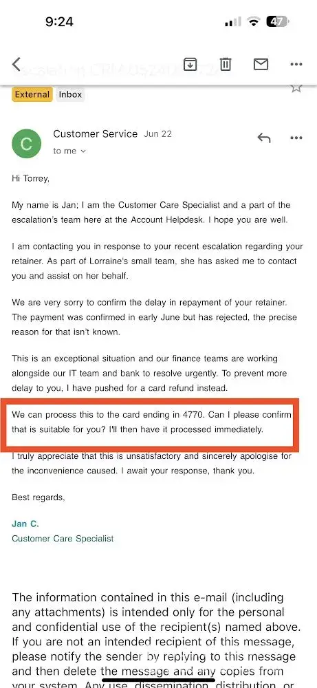 We are very sorry to confirm the delay in repayment of your retainer. The payment was confirmed in early June but has rejected, the precise reason for that isn’t known.
