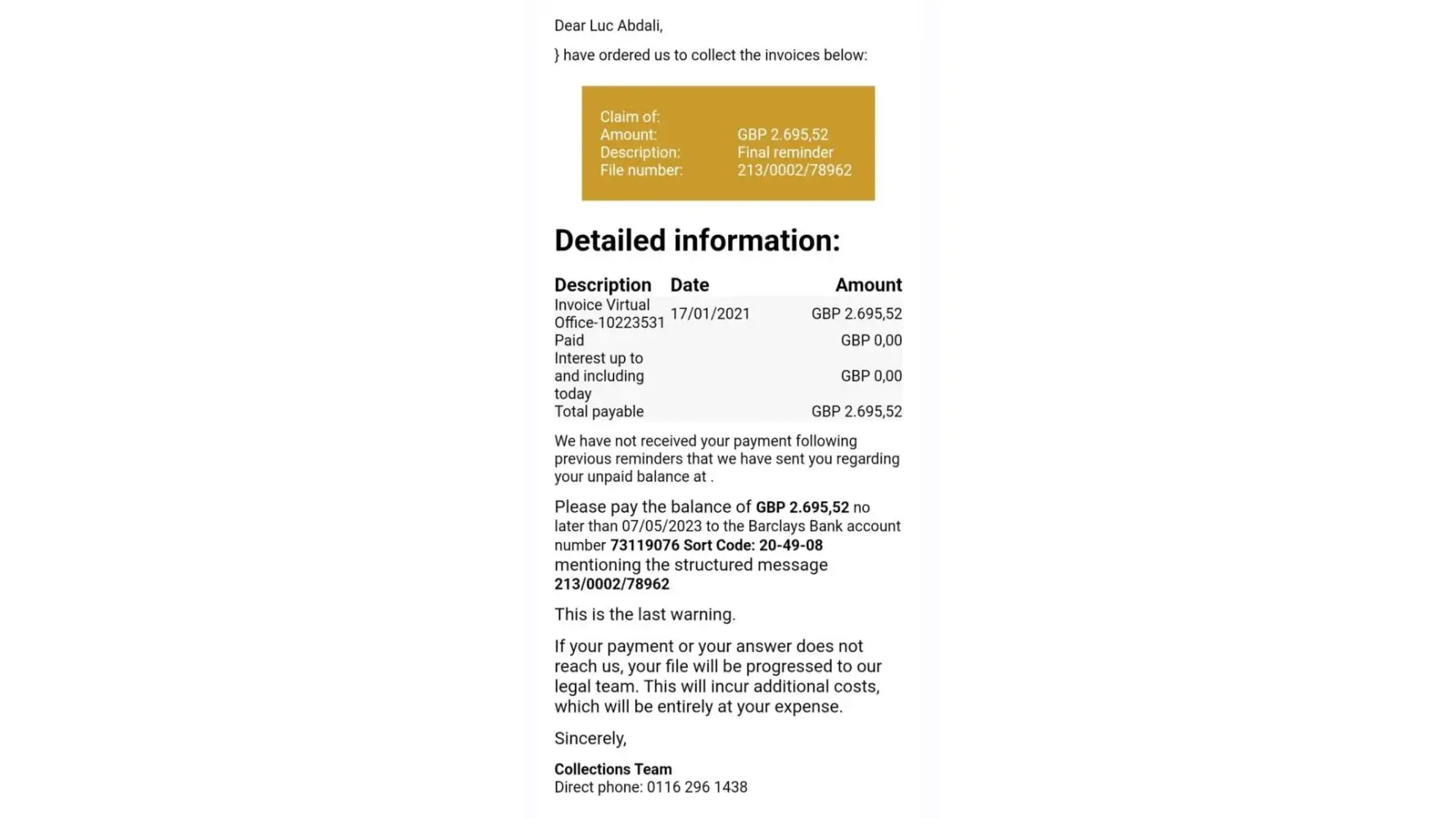 Hello and thank you for the replay. I hope this letter finds you well. I am writing to express my deep concern and frustration regarding the ongoing situation with your company, specifically related to the virtual office services provided by Virtual Office-[protected] since 17/01/2021. I want to clarify that I have never utilized your virtual address service before, and despite initial discussions, I did not proceed with the agreement and I never give my direct debit details due to unresolved issues with the contract terms. I have made multiple attempts to resolve this matter, yet I continue to receive threatening letters from a debt collection company, which is causing significant distress and amounts to harassment. I insist that you rectify this situation immediately to avoid further legal action and to seek compensation for the disturbance caused.