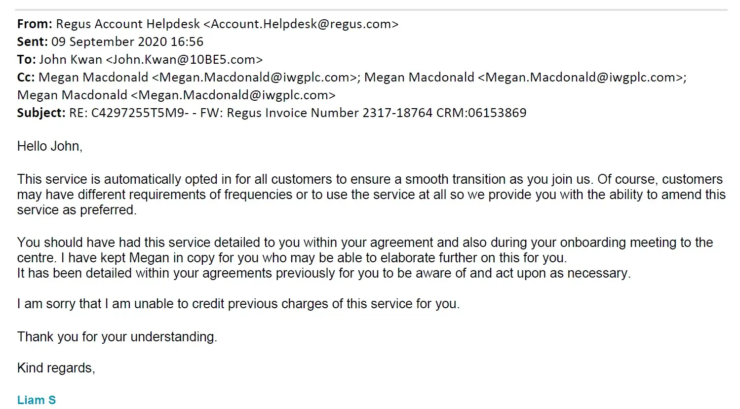 I trust that Regus Corporate Virtual Office values its customers and takes matters of customer satisfaction and fair business practices seriously. I hope for a prompt and satisfactory resolution to this issue, thereby restoring my faith in your company.