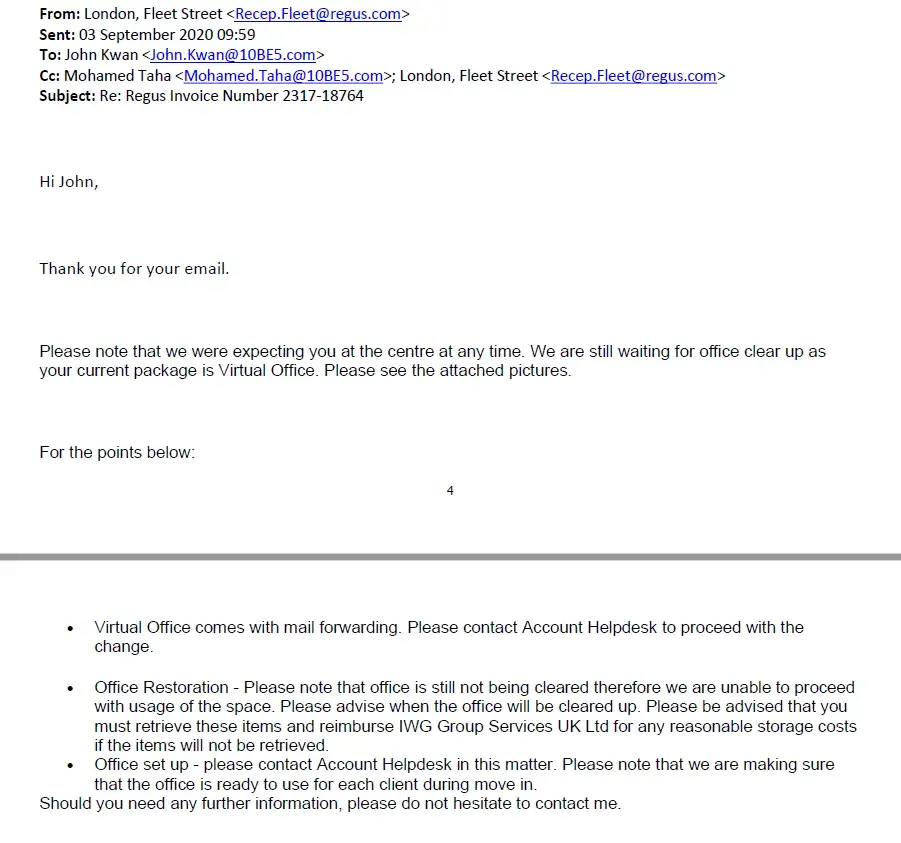 I am writing to you as a longstanding client of Regus, with whom I've had a harmonious business relationship for five years. Throughout this period, I have not once defaulted on my payment commitments. However, recently, I've faced an unexpected issue that has led to some concern. Upon concluding my tenancy, I was unclear about the procedure for settling...