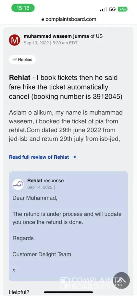 I wonder, how come the established agents like Rehlat fail to secure the legitimate payment from the airline and provide a long-term refund request from a customer.