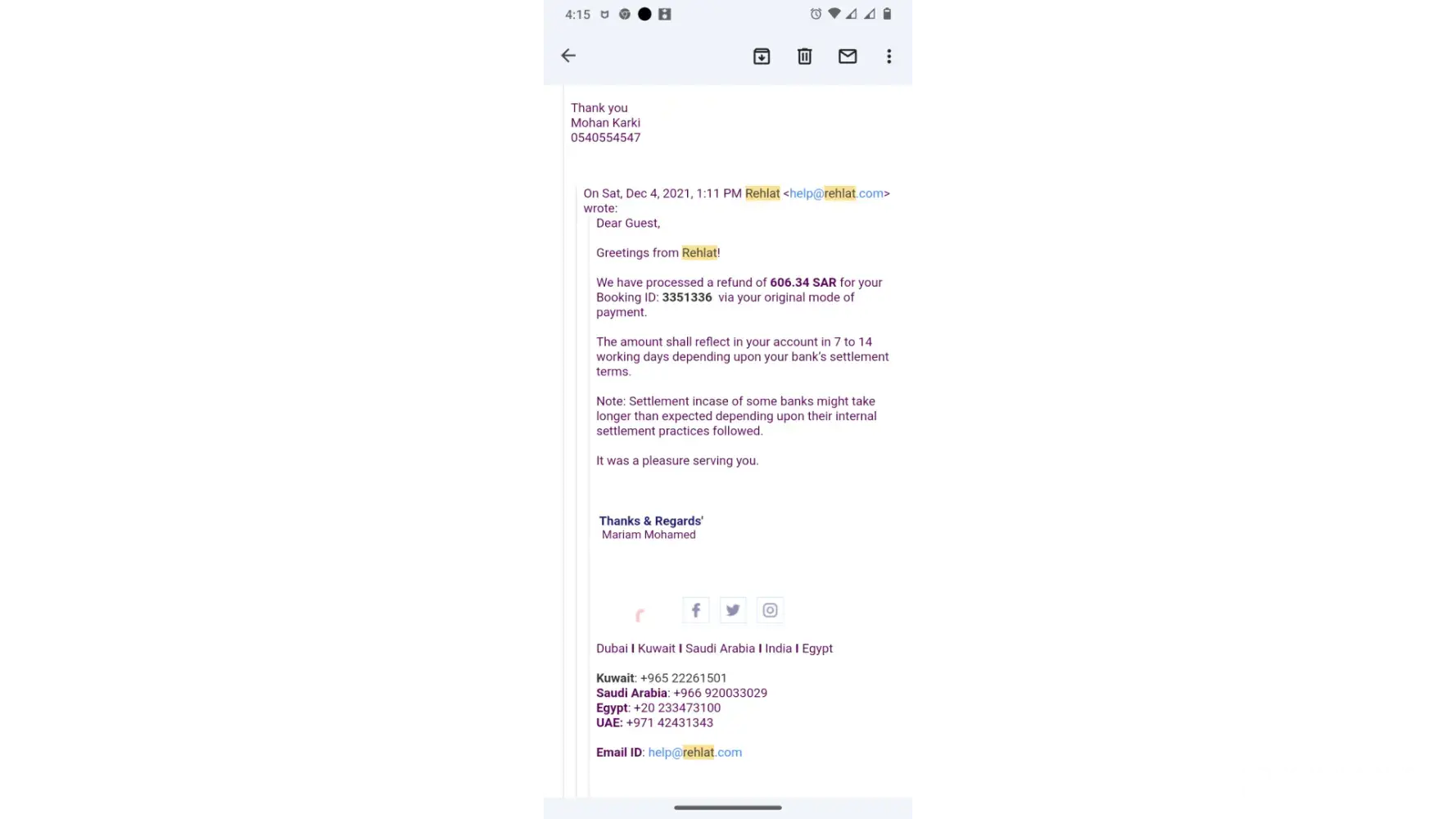 For all this time, I have been contacting Rehlat team to which I get a standard answer that “we are yet to receive an update from the airlineâ€. Rehlat team can refer all the communications with a subject line “Booking ID-SA1429927Eâ€