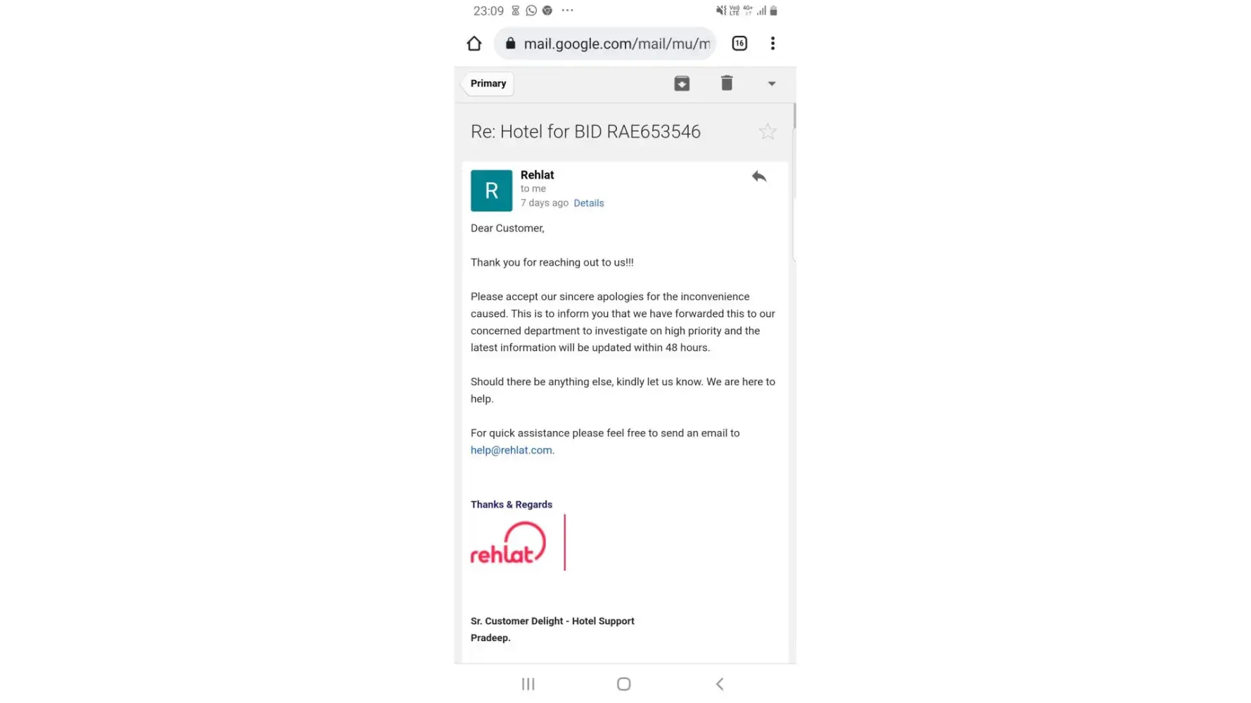 With reference to the booking reference number 327023, Rehlat has not refunded my amount which is due from approx four months. My flight was dated 1st week of spetember and was cancelled by airlines. As per the T&C rehlat supposed to refund my amount within a period of 60days.