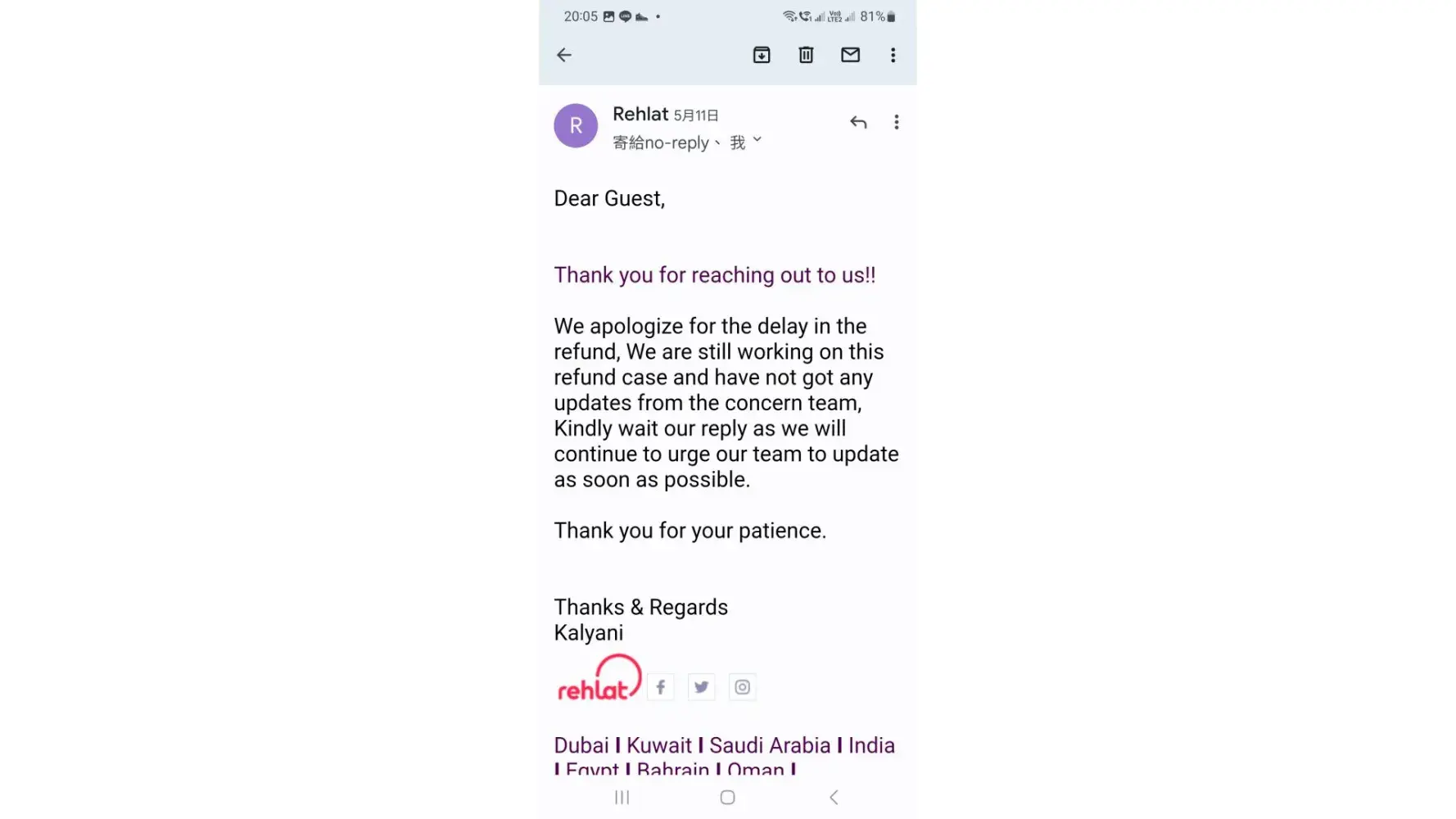 Please find below the email of Rehlat to my agent after cancellation of booking.
