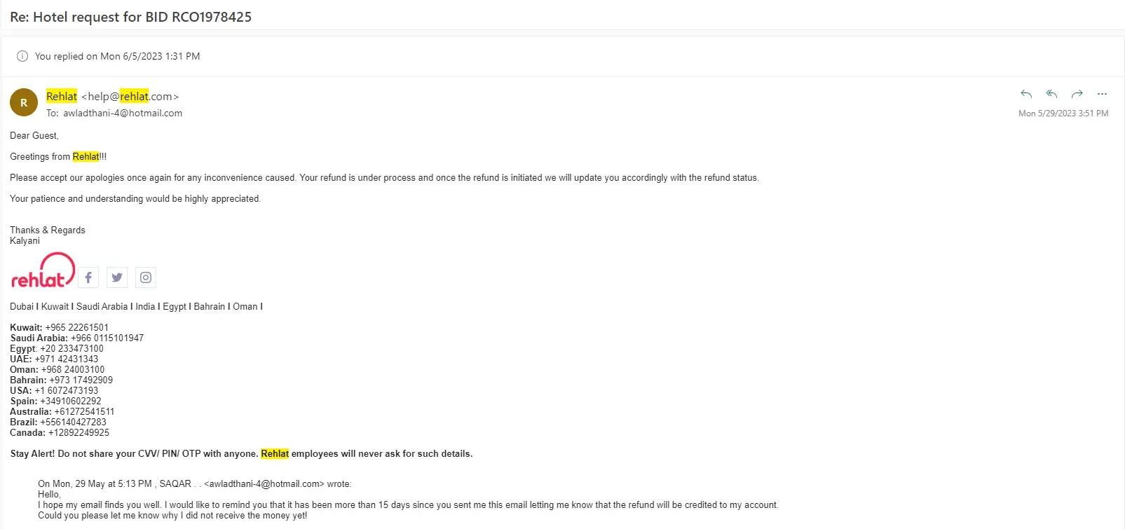 Rehlat, on 10th May, 2023, send an email to me and assured that my refund will be processed in 10-12 days and opened the following ticket .