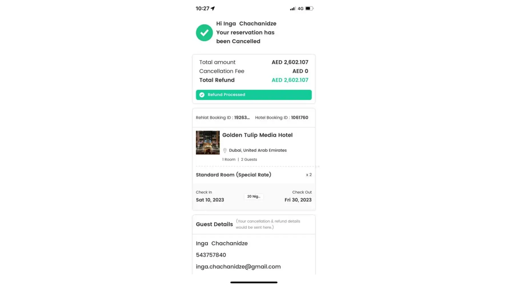Please accept our apologies once for any inconvenience caused. Your hotel booking has been cancelled and a full refund will be initiated for the amount of 2,482,95 AED & 1,738,068 AED for booking I'd Rae 1926348 & Rae 1926244 ,Which will be credited to your respective bank account with in 10-15 business days.