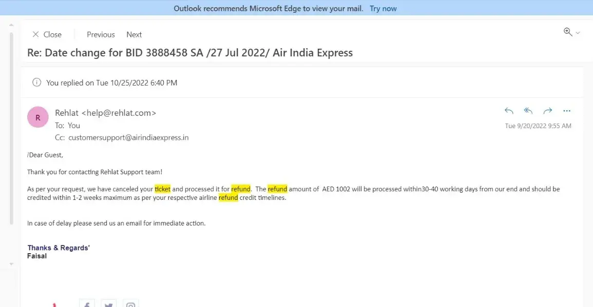 Upon officially compaining to Air India and Rehlat, Air India made a reiumbursement to Rehlat of AED1,002 on Sept. 14, 2022 for my return ticket.