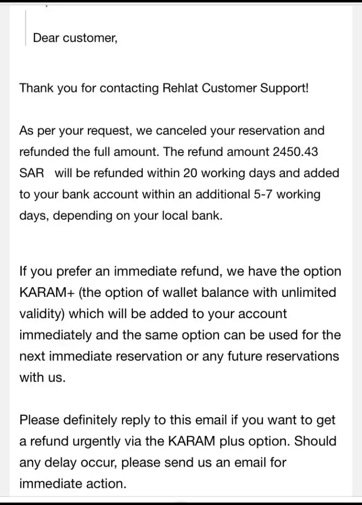 I cancelled the reservation and its been three months already, i have not received my refund yet. I reached out to customer service team and they says the request has been created and someone from the team will reach me back but they never do. Its really frustrating..! Definitely not recommended to anyone. We made a booking with Rehlat in MARCH 16 (booking #RGL1640631) and cancelled the reservation on MARCH 25 and i have received an email that cancellation request was received (ticket number 1135233). We called they said they couldn’t retrieve the ticket hence promised us they’ll be processed within 2-3 working days and should be credited within 1-2 weeks maximum. Here we are 3 months and countless of calls after haven’t received any payment yet. Every time I called they promised to speed up the process & will update the refund status within 24hours via email but there was no email received for any of the calls that were made!! Need some help with this.