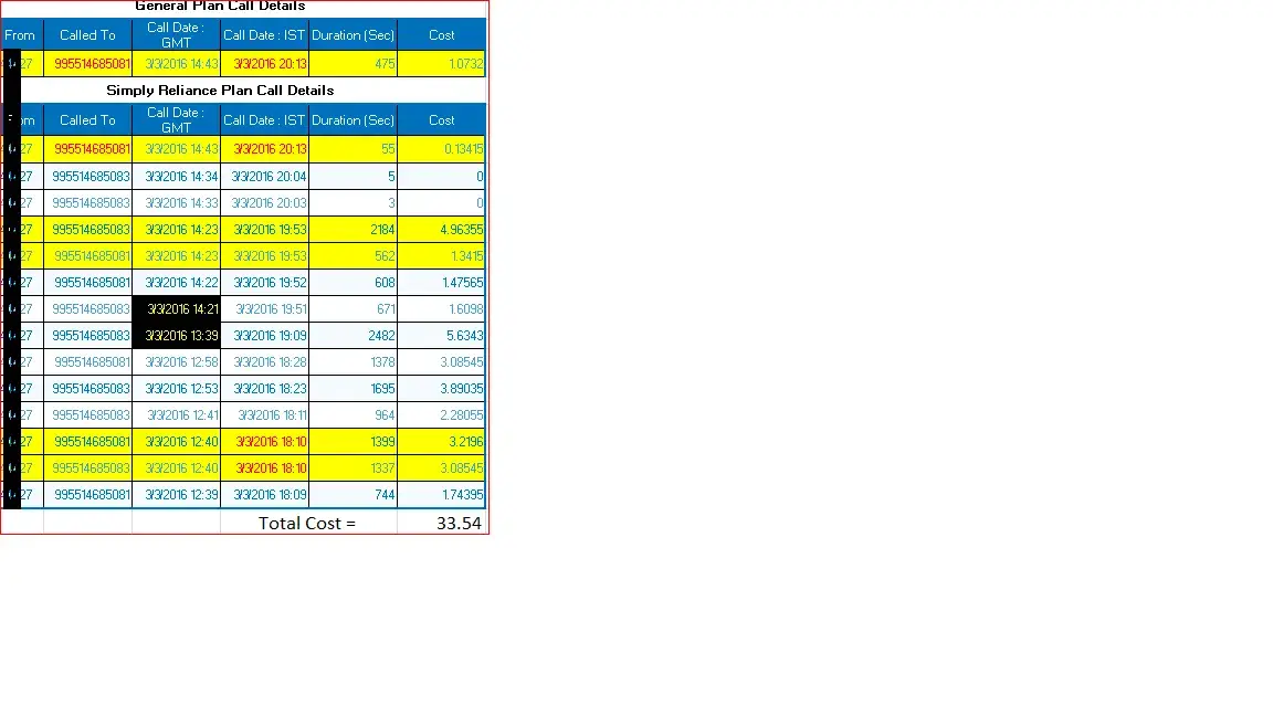 Called from called to call date : gmt call date : ist duration (Sec) cost