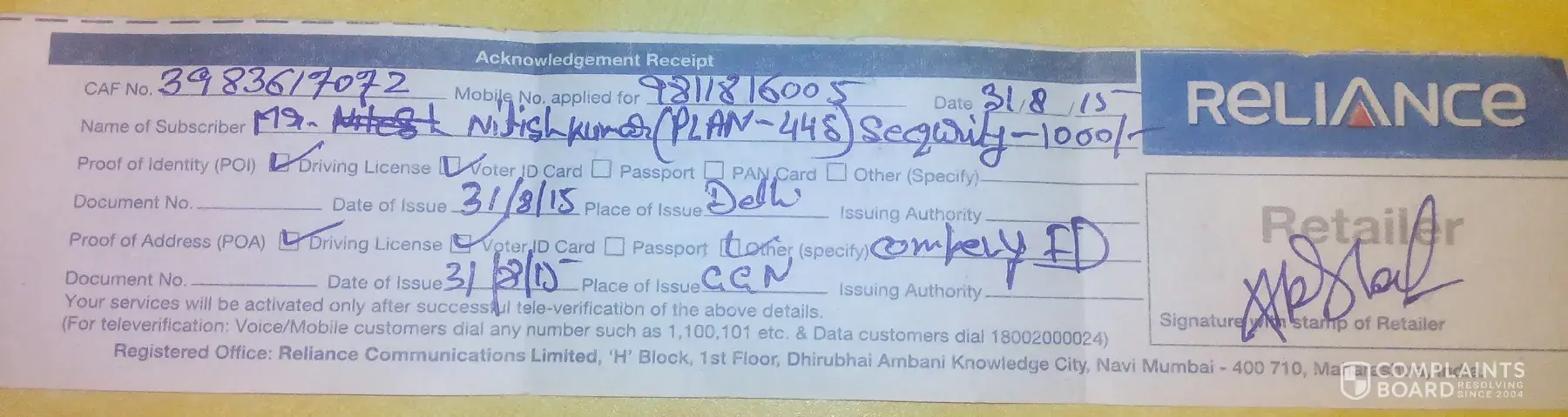 Today, 10 days later, I have received Reliance SIM card & i called for activation on 5909, they said according to your electricity bill address was mismatch but actually i was not submitted electricity bill as a proof or photo id. me submit Aadhaar card as a photo id & proof.