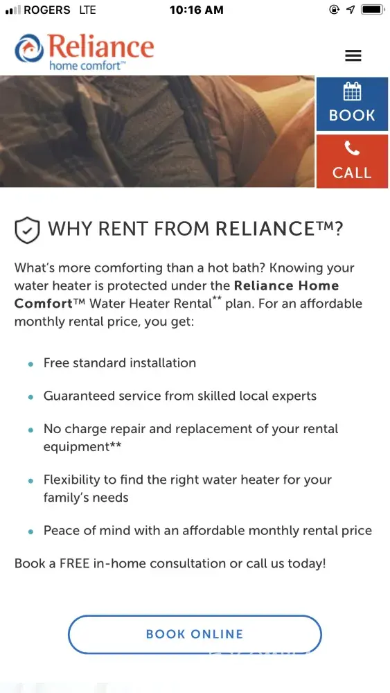 I was told by the agent that there is no technician available until Tuesday November 5th, between 10am and 2pm. When I asked if they had a tech on call, the answer was no. When I asked if they had a subcontractor on call to send out, no. I asked if someone can come Monday, no. Finally I asked if someone can come between 8am and 11am on Tuesday because I need to be at work, no. Last ditch effort to have this resolved timely and without missing a full day of work wages, I ask if they can send someone out on Wed AM or Friday anytime, no. To top it all off this water heater rental is past it's life expectancy of 12 years. I don't understand how this is acceptable when you pay into a rental agreement. Reliance is 0% reliable, does not ensure equipment is switched out when it exceeds life expectancy and they do not have the 24/7 support they claim. Very disappointing and frustrating experience.