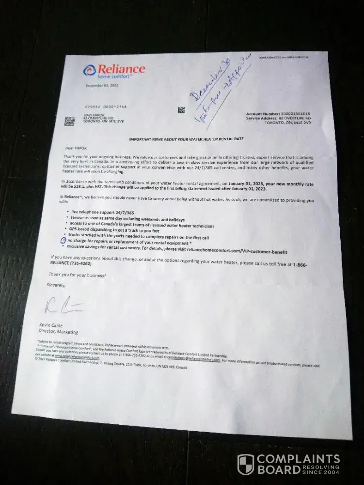 My name is Simona Brace, and I live with my husband at 100 Ivy Glen Dr, Maple, Ontario L6A 0P2. We have been loyal customers of Reliance Home Comfort for more than 16 years who pay our dues on time without any concerns or delays. Both my husband and I have been satisfied with this company for the service they provide. Recently, on November 10, 2022, our furnace stopped working and based on the Reliance technician, we had to replace it with a new one. Mr. Jackson Jian, a sales representative, came and provided us with a few options for the furnace replacement. We were more interested on Goodman brand, and we got the price for a new one of $4900+ tax and a free thermostat and filter as per the Reliance package advertisement. Paying lump sum was expensive for both of us, so we decided to rent it, which came up with $90 / month for 84 months by Jackson's calculations, and I signed the agreement. My daughter, who is a lawyer, offered to pay the whole amount after we talked with her. The next day on Saturday, November 12, 2022, when Jackson came to our house to set up the thermostat, I told him that my daughter will pay it off right away, and he agreed upon it, but he required a couple of days to work on it.