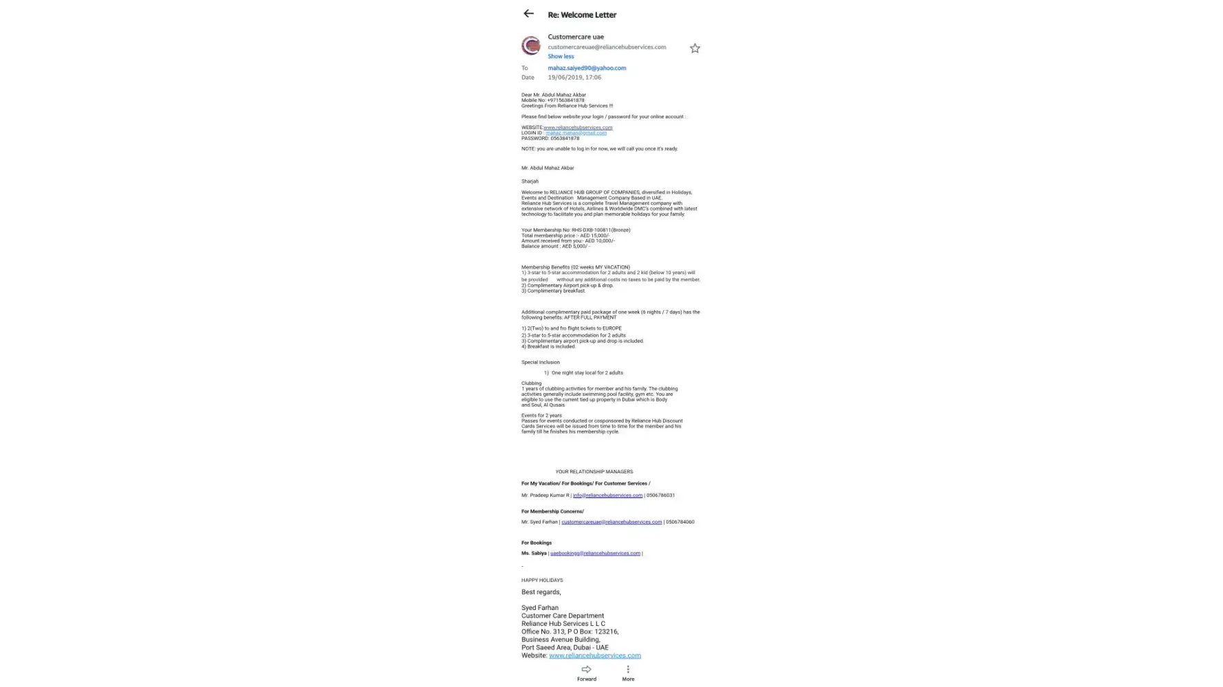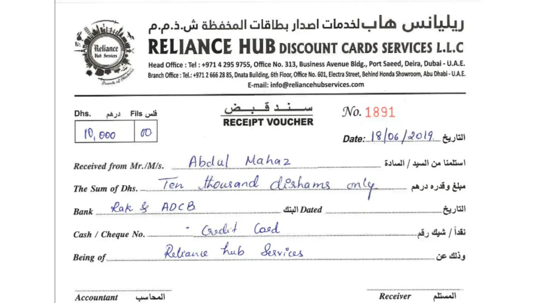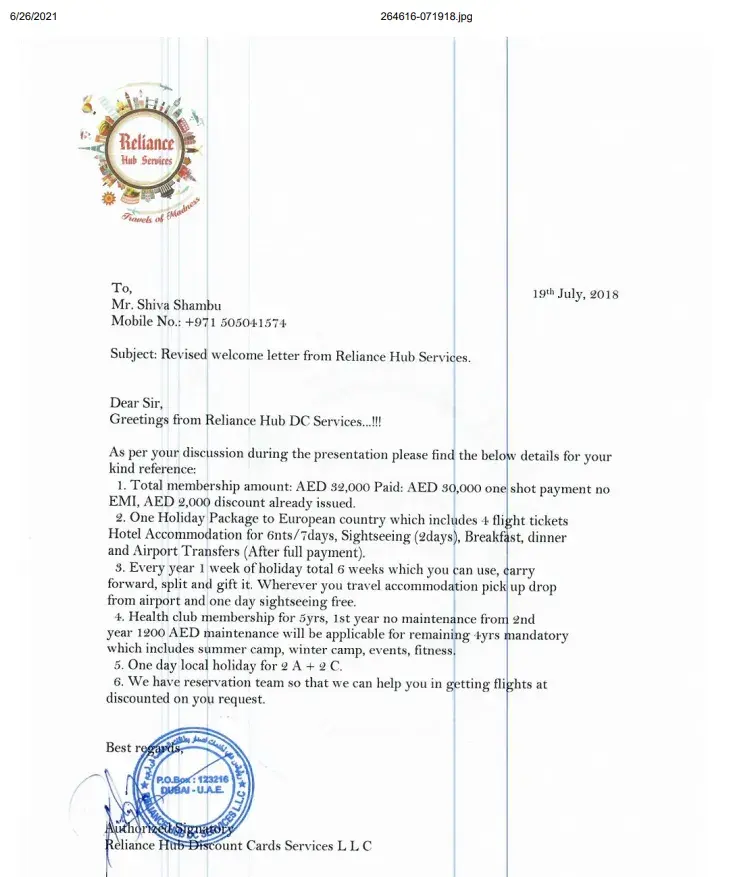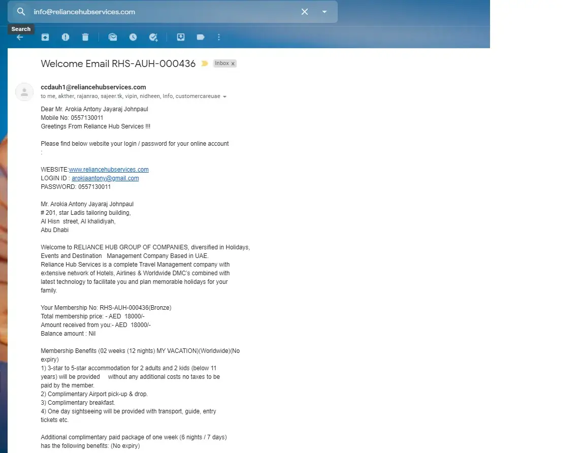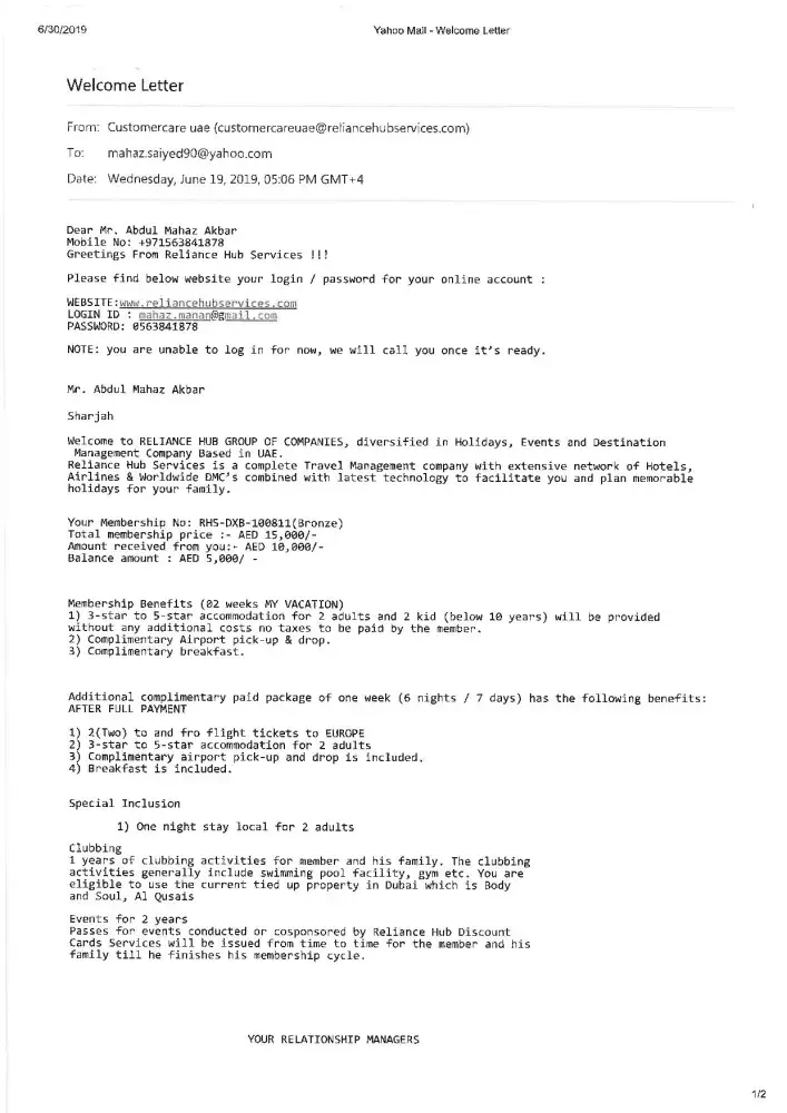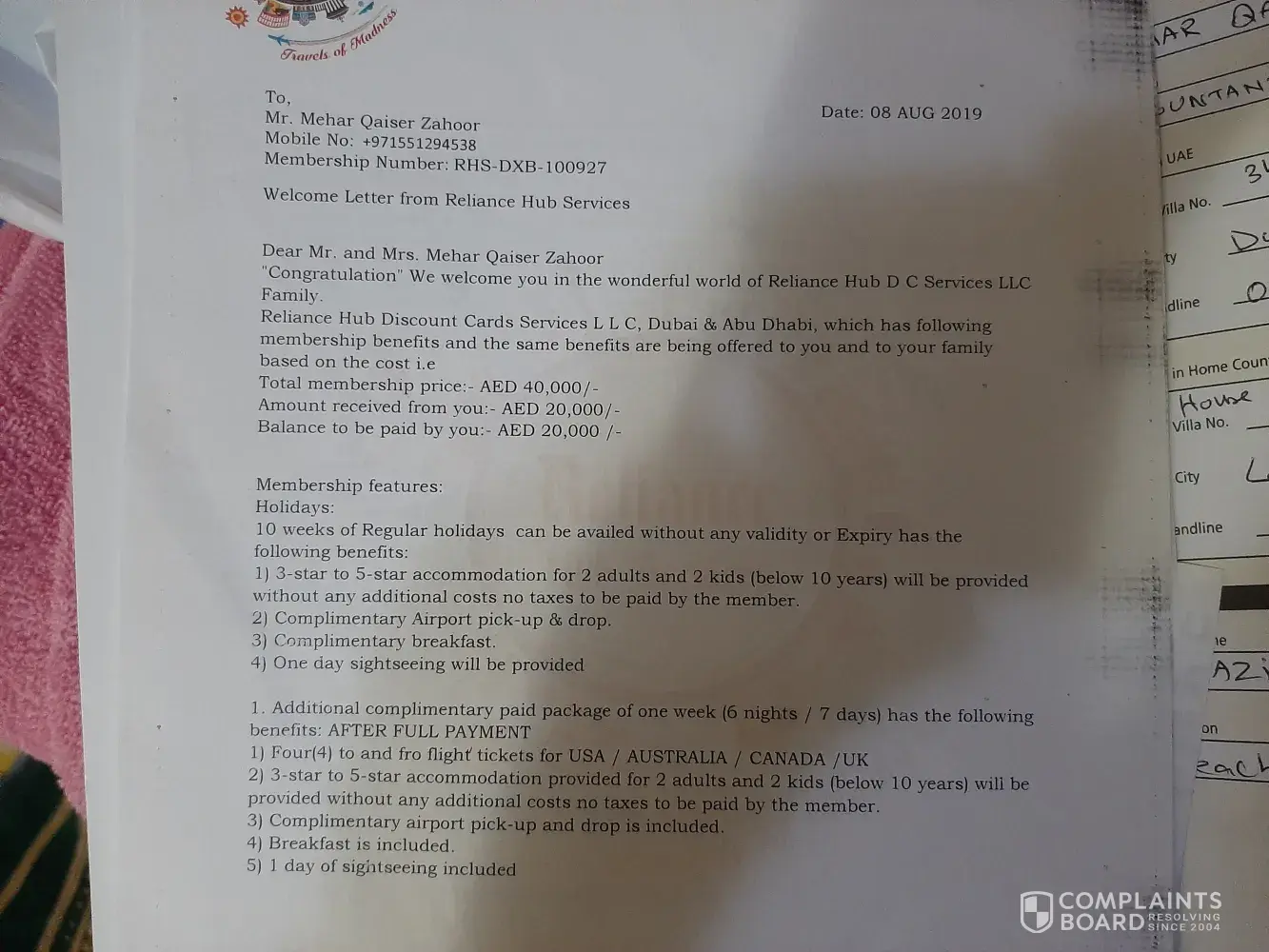 I have take a membership from Reliance Hub on 1/12/2018 which I have paid amount of Aed:6000/- for the same. After few months of registration, I tried to call them to avail one of the gift voucher which has been issued by them, but unfortunately the number was got disconnected and even tried to call their mobile phones but it’s answered by someone else, later on came to know that the company has been closed without any intimation to their clients.