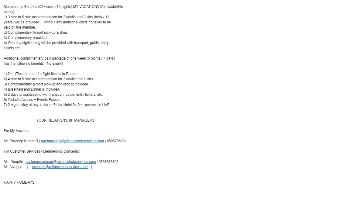 I bought the package from them at AED 30, 000, in 19th July 2018 . One Holiday package to European country including 4 Flight Ticket and Hotel accommodation and food for 6nights /7days and one week holiday total 6 weeks holidays in six year. contacted Persons Kavita, Pradeep, Akther, sridhar and Ranjan rao, Now I was after them for hotel booking but every time, they have excuses and it being more than two years now. Since I could not get any benefit from them I requested them to refund the Amount. but they never returned the Money. Now their emails and Phone numbers are also not working. I am convinced that hey trapped me.