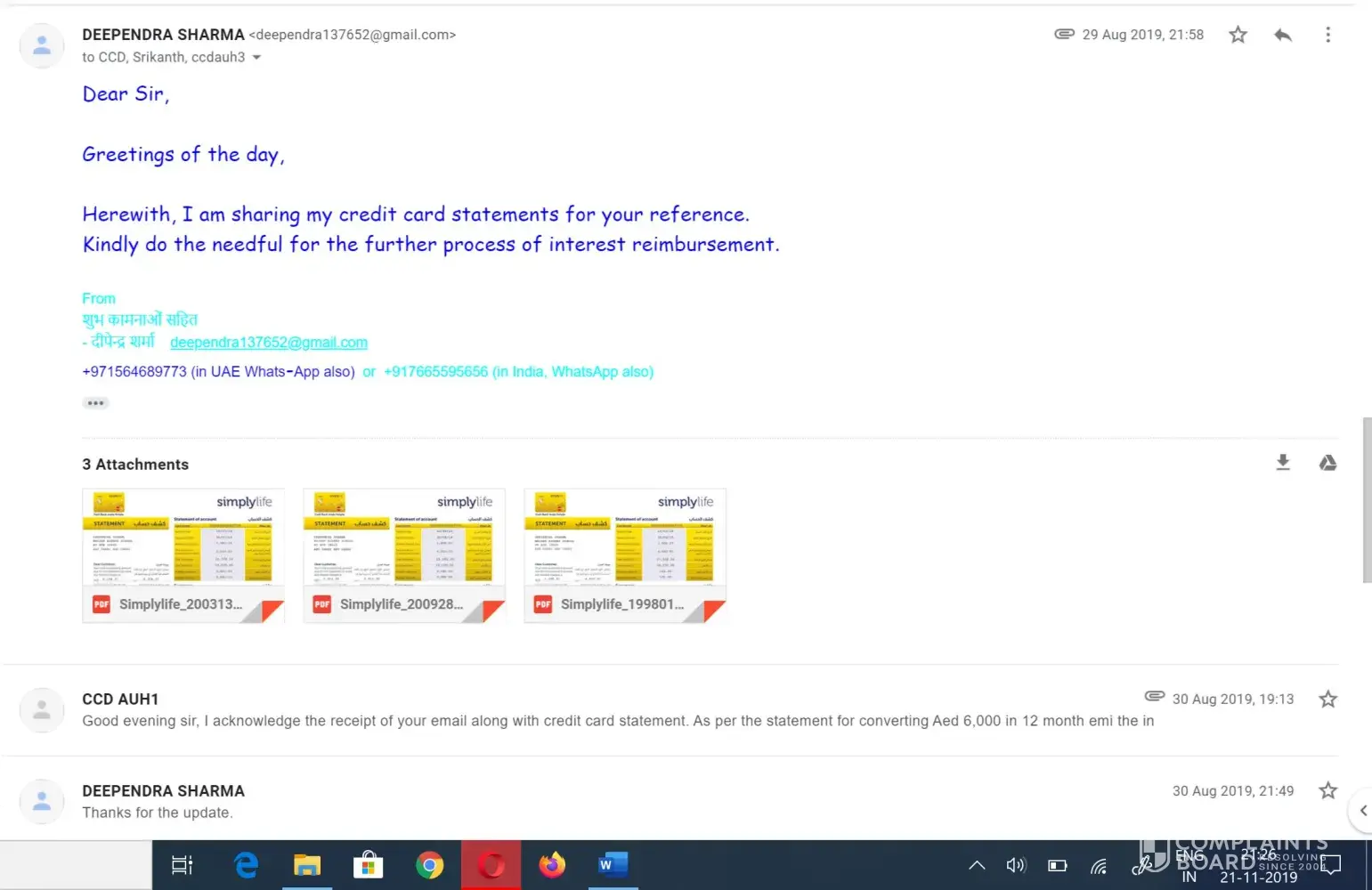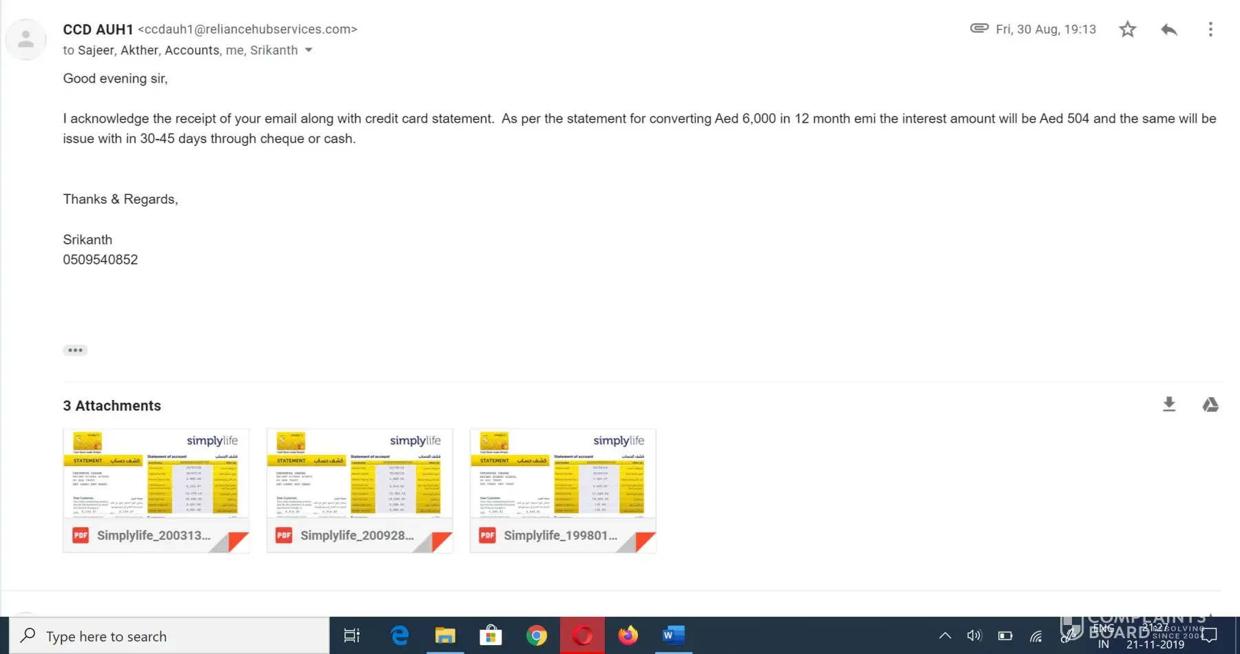 Herewith, I have taken lowest interest rate plan of 0.70% per month with adcb credit card and requested to reliance hub services to reimburse the calculated amount of only 504 aed on 29th august 2019 sending an attachment of credit card statement. (refer image -2)