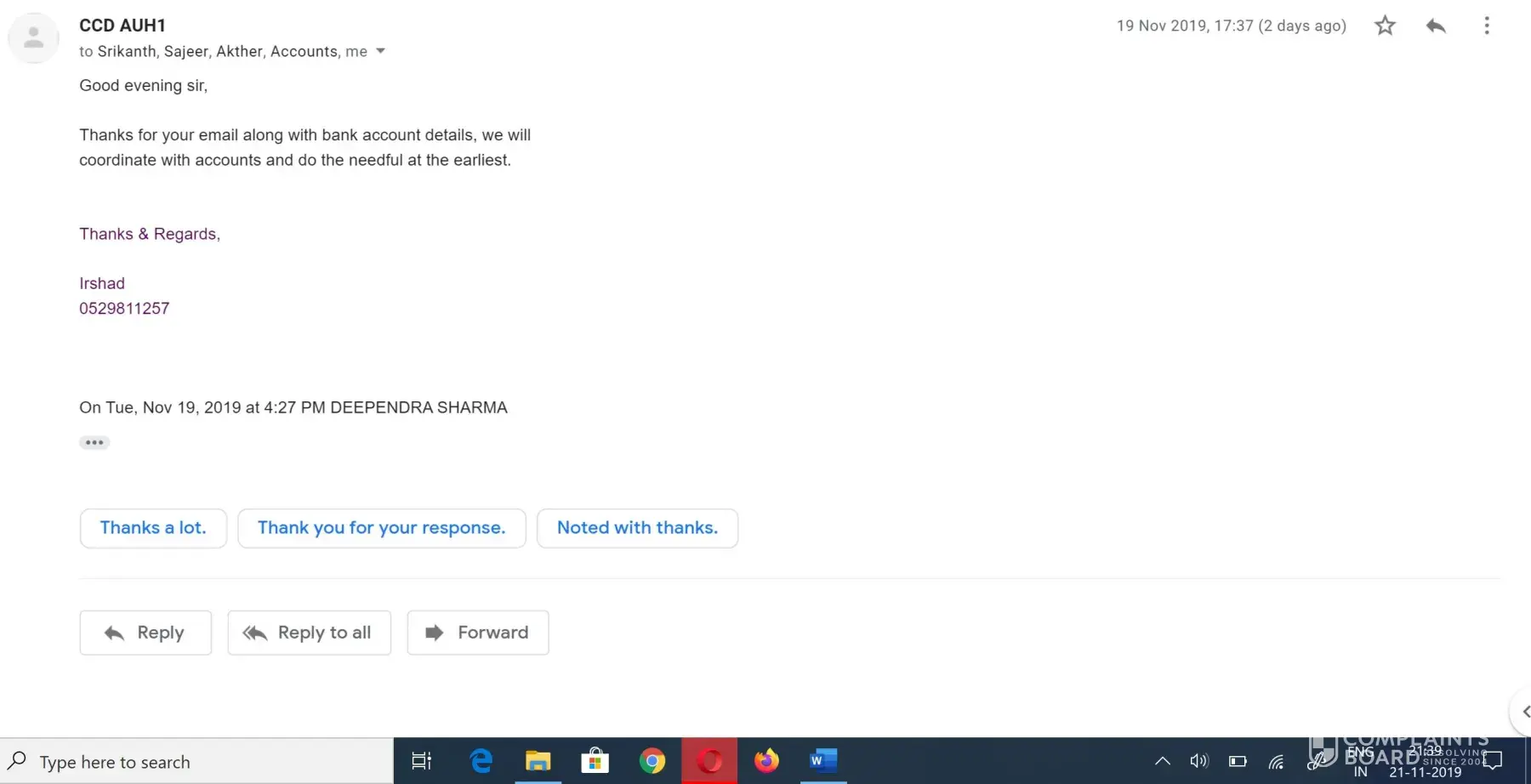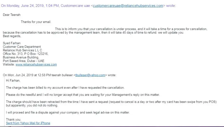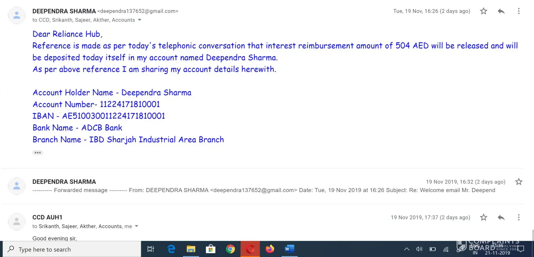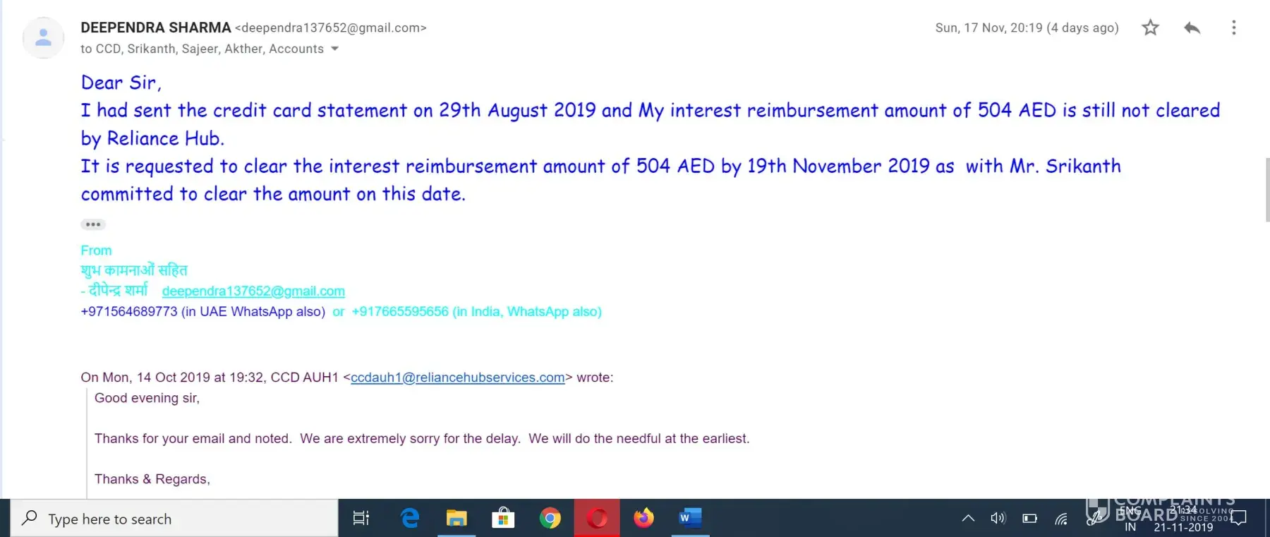 They started keep delaying every time, can refer image 3 to image 10. Until today no any positive response to disburse the interest amount. On mail they just type "they will coordinate with the accounts. They will do the needful at earliest." however, account email id (ccdauh1@reliancehubservices.com) also was same when they confirmed about amount 504 aed and will release in 30 -45 days on dated 30th august 2019.