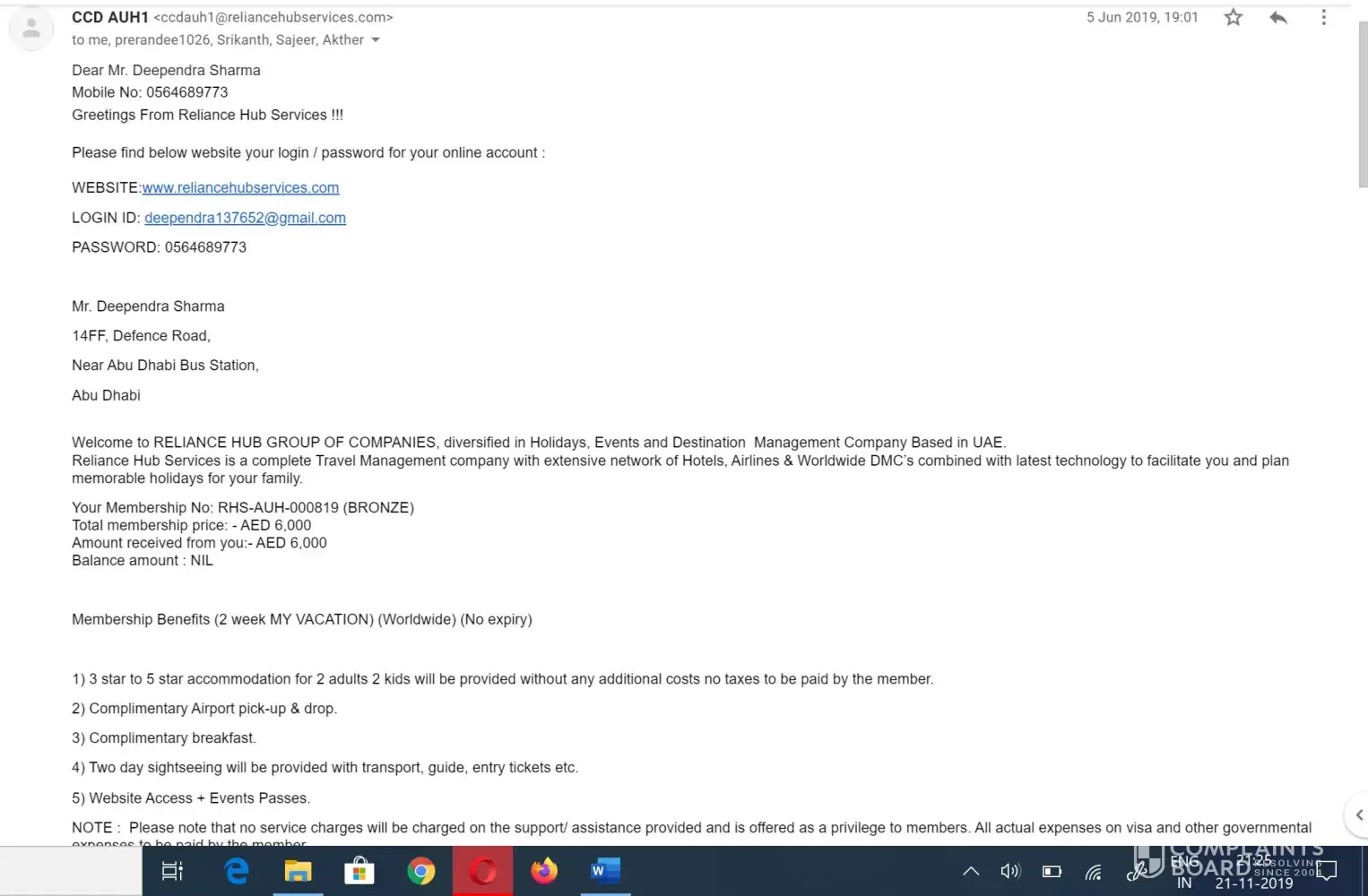 I was customer of gulf royal travel and tourism, and I had a package of 30000 aed with gulf royal. After just for a trial I purchased a small plan from relaince hub services as well on 03 june 2019. I received confirmation of membership as well on 5th june 2019 (refer image -1). As per policy and commitment made by sales advisor mr. Akabar ali khan, 0567776004 (now mobile number is out of coverage area) that they will reimburse the interest amount for installment plan taken in paid amount. He promised to reimburse the amount immediately at one time payment.