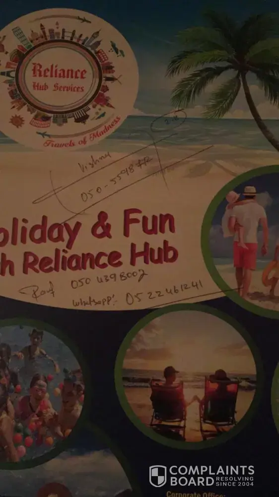 I'm complaining about the reliance hub services in abu dhabi. I avail their product on may 2 and due to my financial status i need to refund my holiday package which they told in the meeting that i'm allowed to do it within 1 week with 5% deduction. I did request a refund after 2days then the guys are saying 4-5days approval and 30-45days for the cheque release but it doesn't happen even approval letter i didn't receive i got back to their office and ask the status that time they said 25% deduction of paid fee. They're inconsistent. Then they offer me to convert to consumables with no deduction i booked a ticket for 4 manila to hongkong to manila. the next followed up they said thre is still 25% deduction. They said 4-5days they gonna send the flight details but i waited for 2weeks no messgage. I threatened them that next time i will pay a visit i will bring a police that time they send an email. If anyone would want to file a case to this company i have contacted a legal assistance already we need atleast 10 people so we can get 100% refund and also a damage fee for us. Please contact me on +[protected]