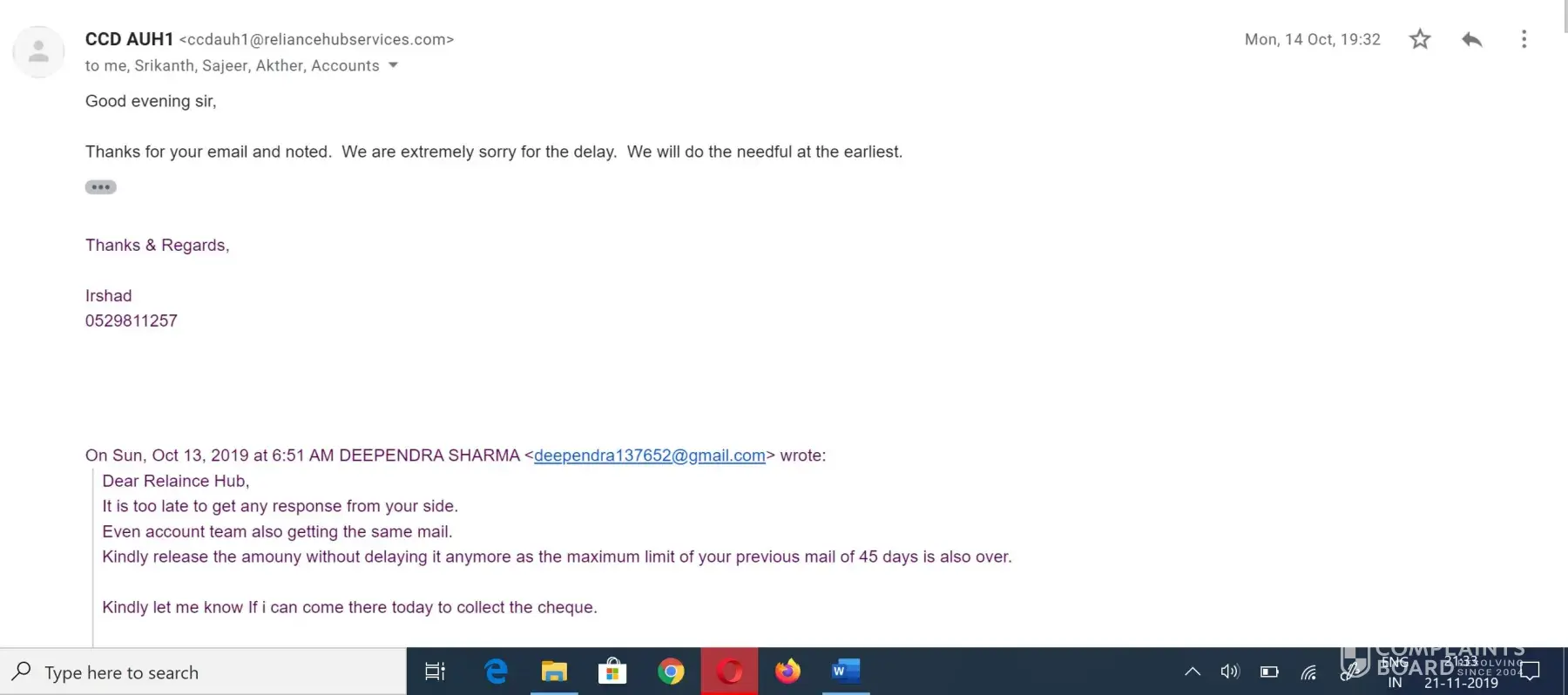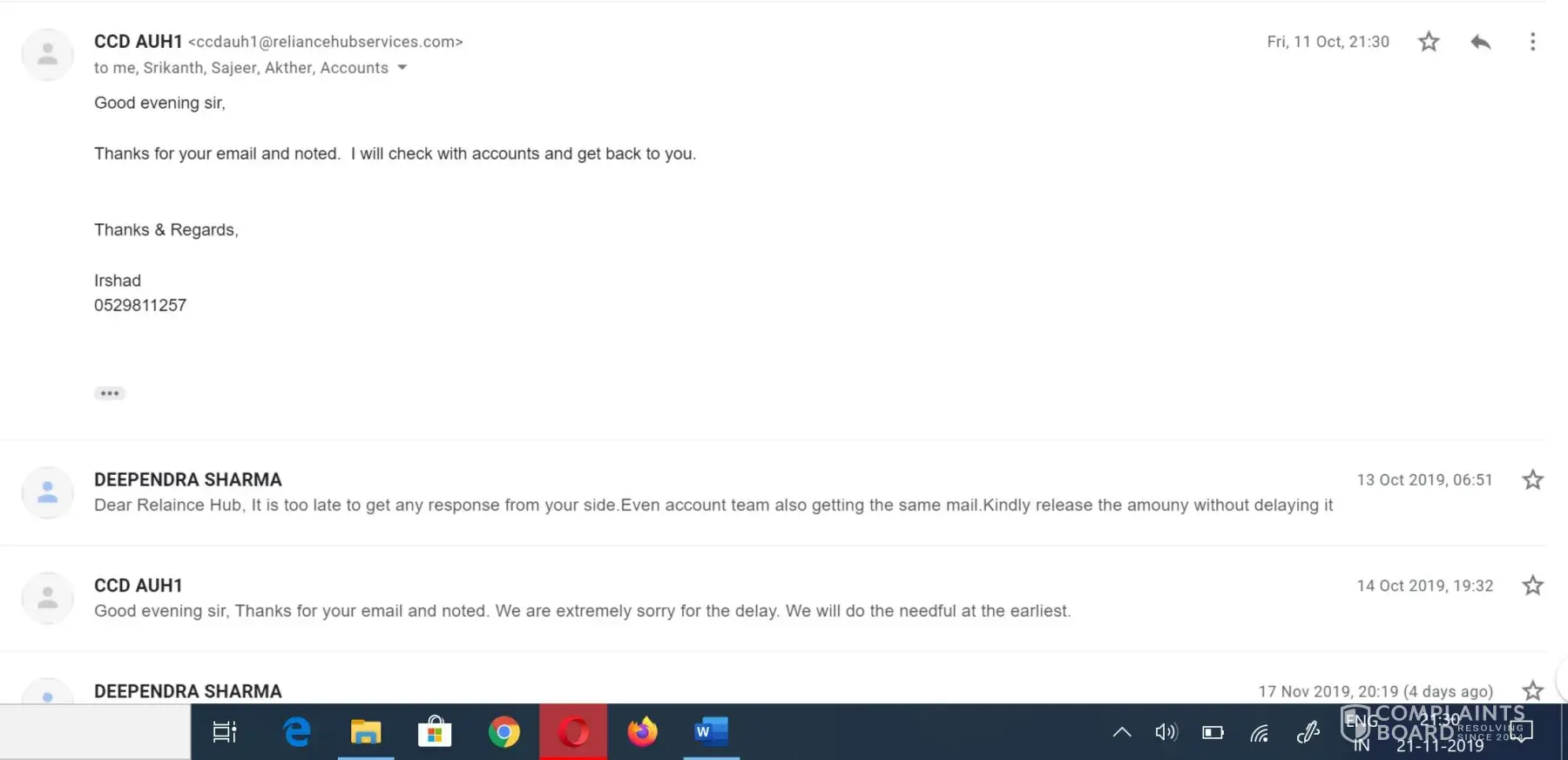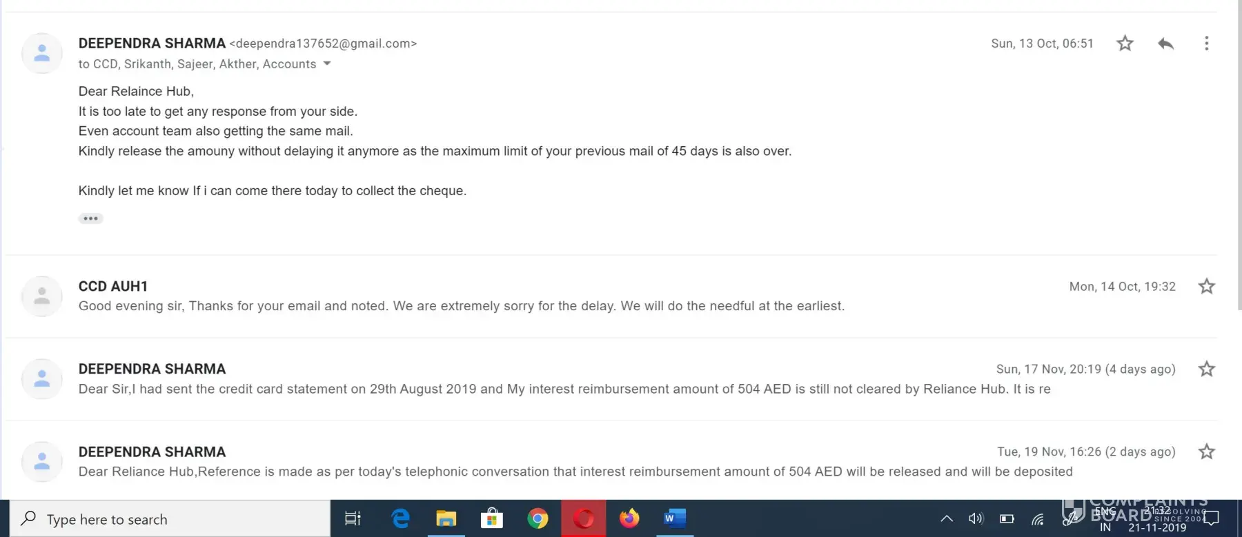 They started keep delaying every time, can refer image 3 to image 10. until today no any positive response to disburse the interest amount. on mail they just type “they will coordinate with the accounts. they will do the needful at earliest.” however, account email id (ccdauh1@reliancehubservices.com) also was same when they confirmed about amount 504 aed and will release in 30 -45 days on dated 30th august 2019.