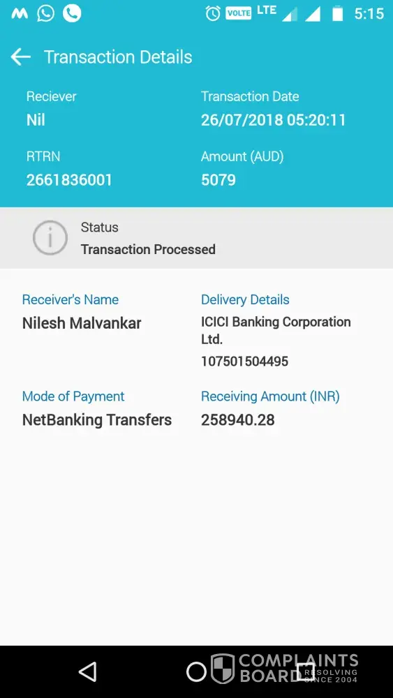 My receiving amount was INR 258940 when I initiated a transfer from AUD to INR.