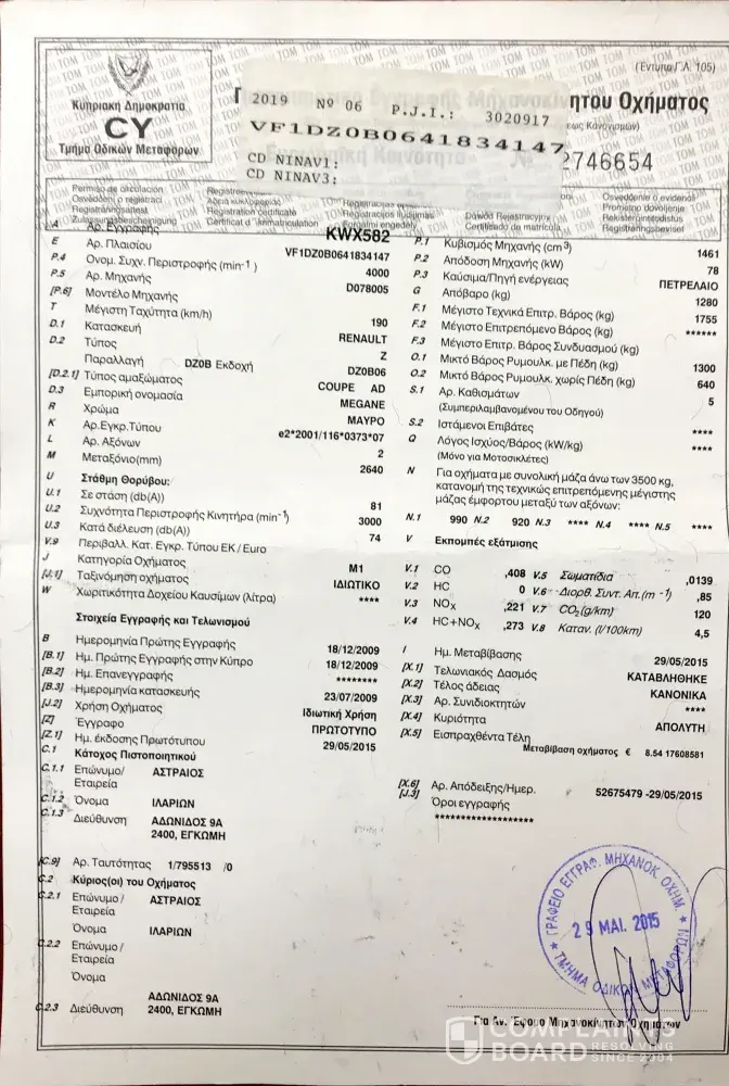 I'm an owner of a Renault Megane, diesel coupe with Cyprus registration number KWX582.