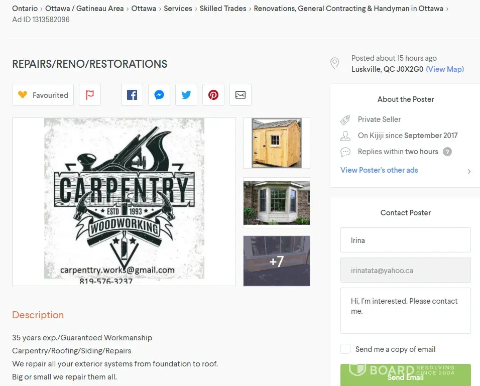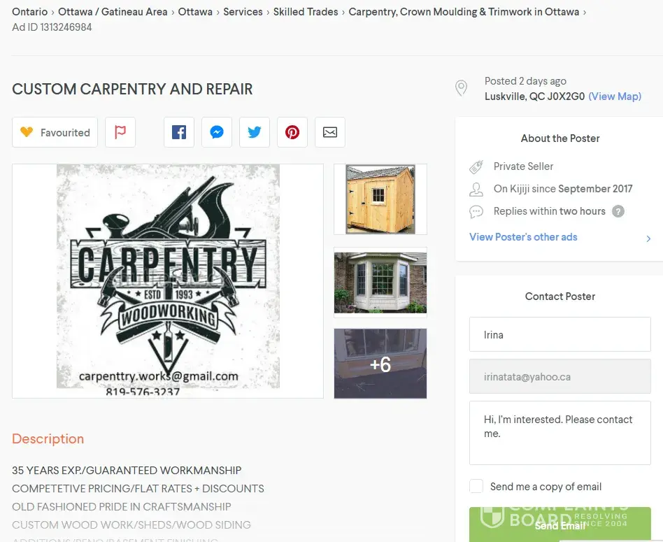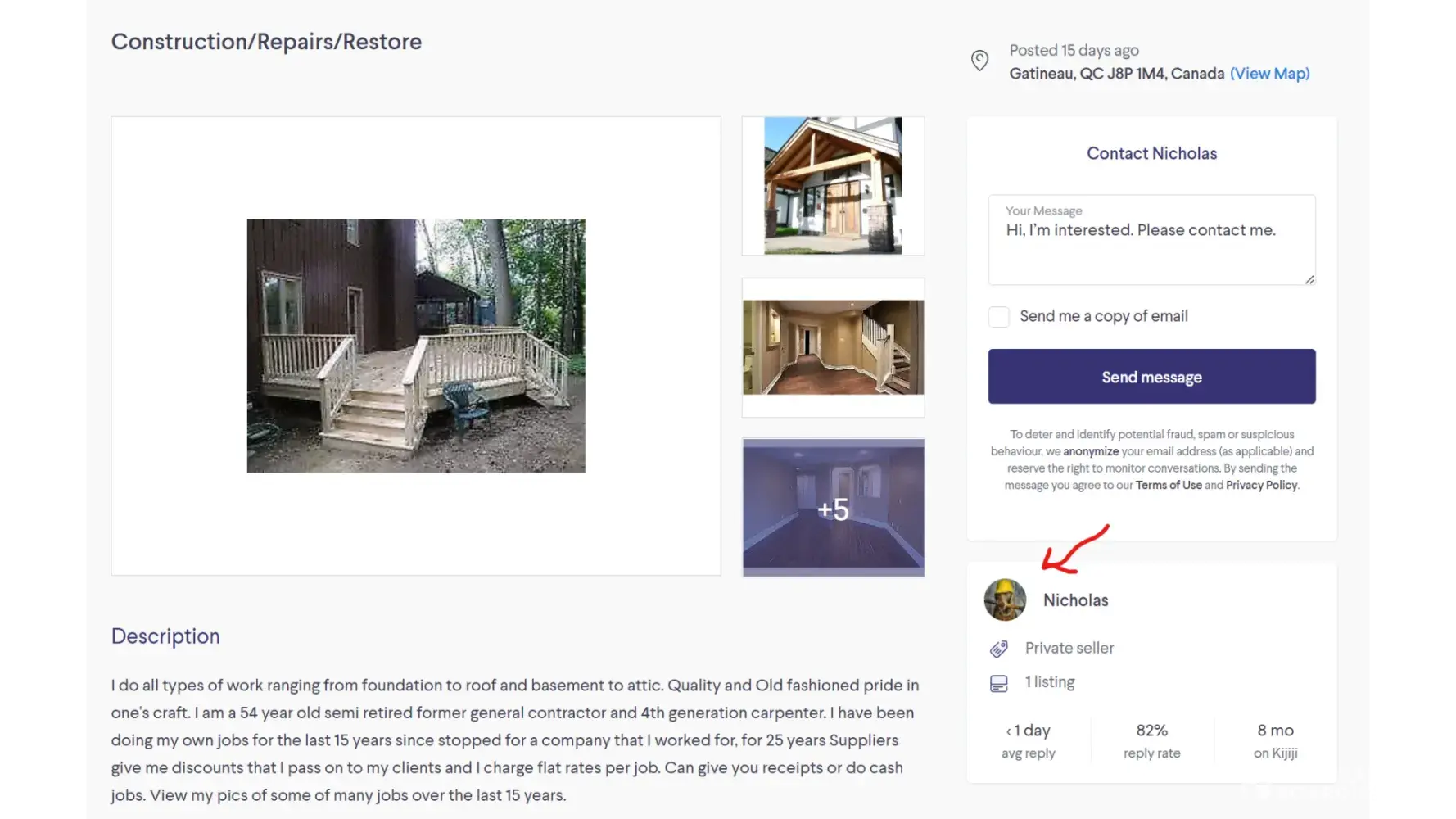 We filed a case with the Gatineau police as we were certain that he had done this to other individuals. The Gatineau police did nothing despite the detailed accounting and photographs we provided. They indicated it was a civil matter. From the date of these posts, it looks like he is still committing fraud and ripping people off four years after he ripped us off. The Gatineau police should have stepped in.