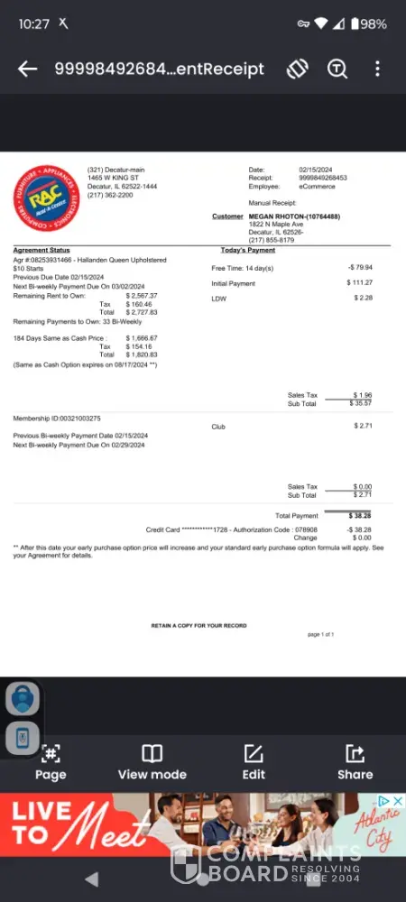 I had a washer and dryer, two beds and a refrigerator and a desk and computer with your company. After several months of billing issues even after speaking with store manager Gayle many times. I could not get the issue resolved with the billing. Pulled my account into overdraft so many times my bank closed my account and I had to go down to the bank and beg them to let me keep my account. Your automatic payment feature should be looked into.