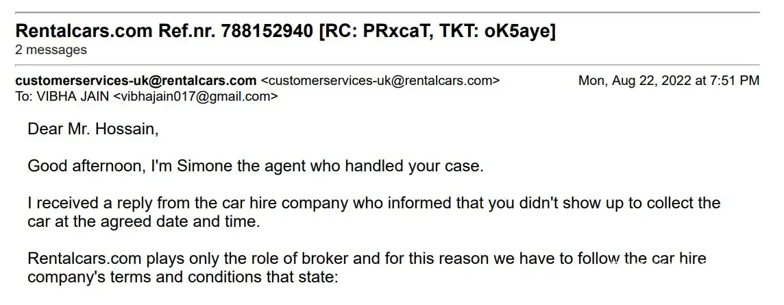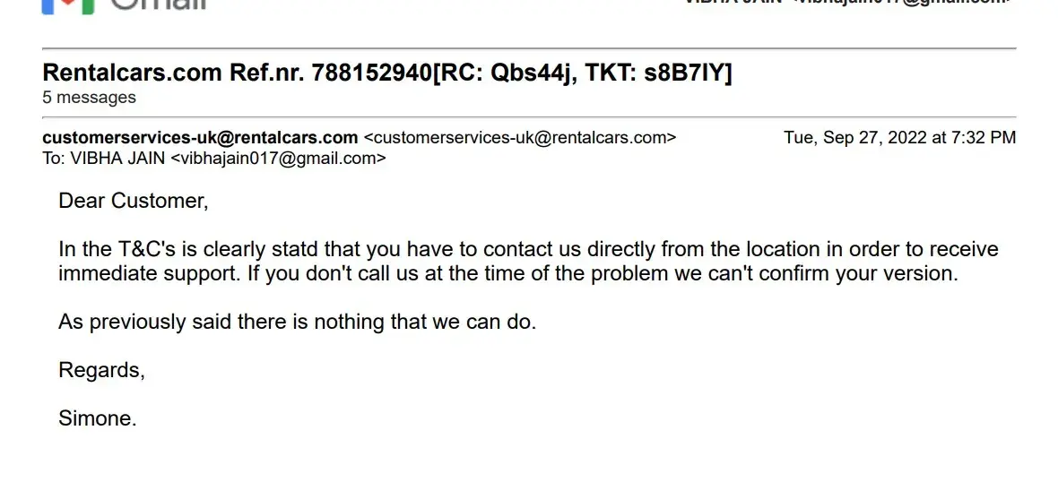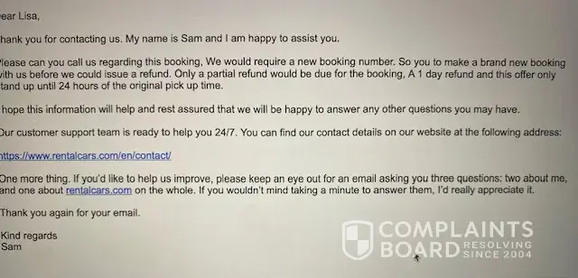 I expect better from a company like rentalcars.com and request that a full refund be issued immediately. I am disappointed with the customer service I have received and hope that this matter can be resolved quickly and efficiently.