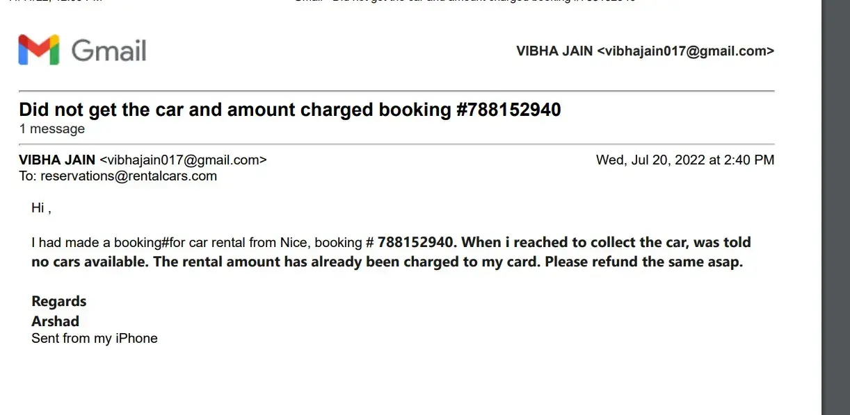 I had made a booking#[protected] for car rental from Nice, When i reached to collect the car, was told no cars available. The rental amount was already charged to my card. I tried reaching rentalcars.com but could not get through. So I sent an email. They promised to do the investigation, and later reverted back saying that the car was provided to me and that I was lying. They refused to refund my money.
