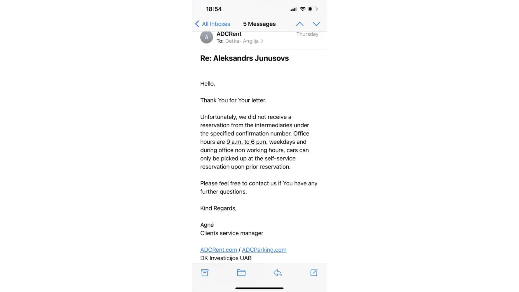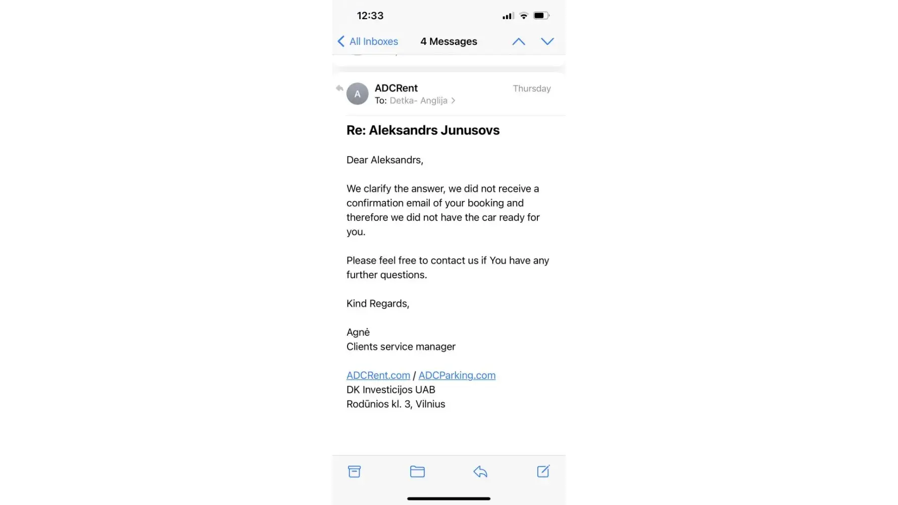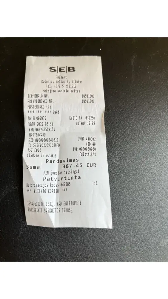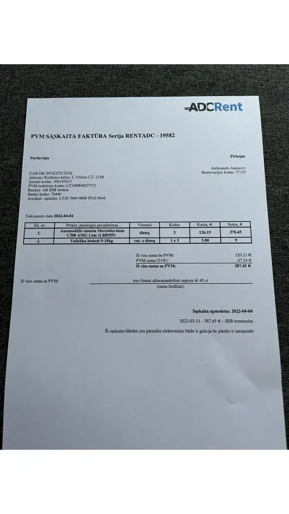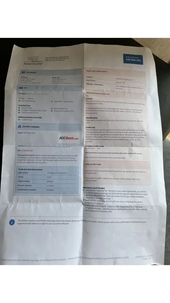 My name is Aleksandrs Junusovs! I had booked and payed (I got payment confirmation) a rental car with wizzair (rentalcars) for 31/03/22 for 3am at Vilnius airport (confirmation number 2096489). At Vilnius airport ADC Rent.com team told me (I got an e-mail from them as well), that they haven't received any information from wizzair (rentalcars) about my booking! So there wasn't any car or any team member, when I had been landed! Also my flight been delayed! It took me few hours to get in contact with ADC Rent, because all rental companies and tourists centers was closed! They told me I can get another car when they open at 9AM! All others rental companies and online services were available similar time! I didn't sleep all night! It was 6am, so I decided to have a rest, before my further trip to Latvia, in local hotel AirInn Vilnius (receipt 63.00 euro=55.10 pounds)! I needed for safety reasons! When I get to ADC Rent office, only one car was available (ADC can confirm that), which cost me 387.45 euro=329.12 pounds! On the top off all it was my birthday! All my plans was ruined! I been 6-7 hours late and it was only 3 day visit to my family to celebrate my 35th anniversary!