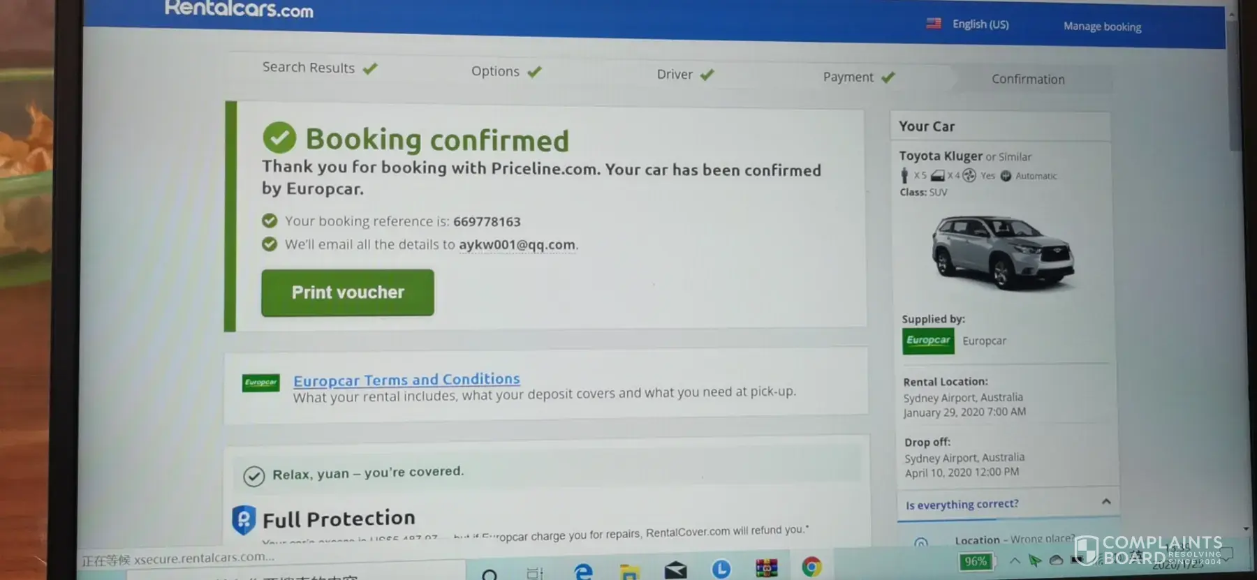 - On the 25th of Jan. 2020, I have booked a rental car on Rentalcars.com picking up on the 29th of Jan. 2020 at Sydney Airport Australia at Europcar counter. When I confirmed my booking for 2.5 months at Rentalcars.com the car type was Toyota Kluger or smiliar and it has been promoted very heavily on its website.