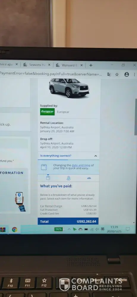 3. I have to cancel my booking at Sydney airport Australia, since I refuse to accept the car that Europcar was trying to replace for me and they would have different size and type of cars offered however refused to review the price that I have paid and lowering the costs since the difference.