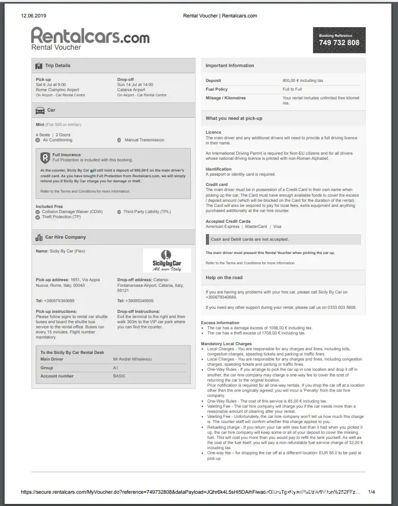 I immediately sent formal complaint to rentalcars. com setting out the chronology of events and requesting a refund.