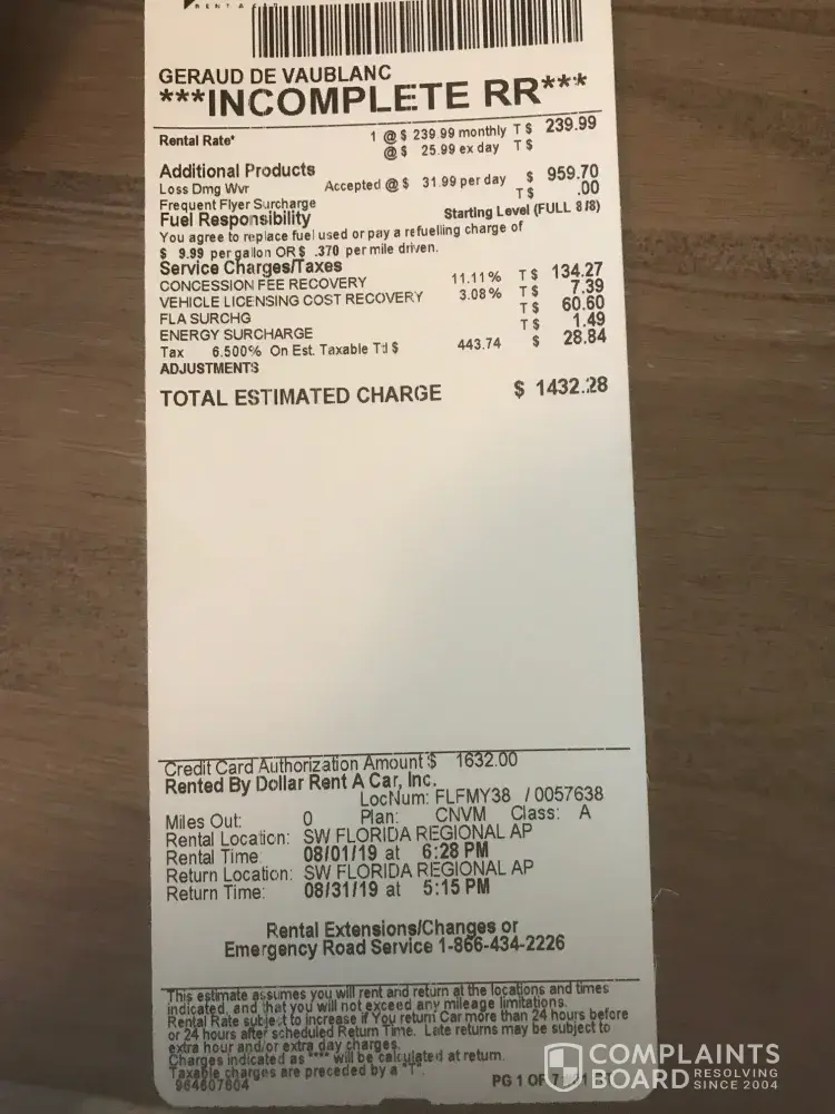 Parce que nous avions de bonnes relations avec Dollar - nous louons depuis 20 ans avec cette compagnie et nous connaissons bien le manager - il a pu nous faire un prix - mais nous avons quand même déboursé 1432, 28 dollars (voir la 3e pièce jointe)