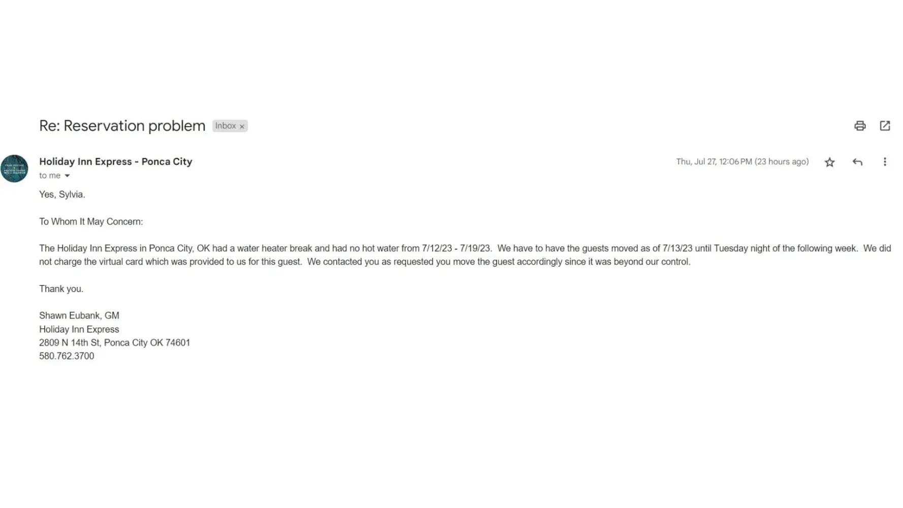 I booked 2 nights at the Holiday Inn in Ponca City Okla. 6/18/2023 through reservation Counter.com THINKING from the website that it was Actually Holiday Inn.