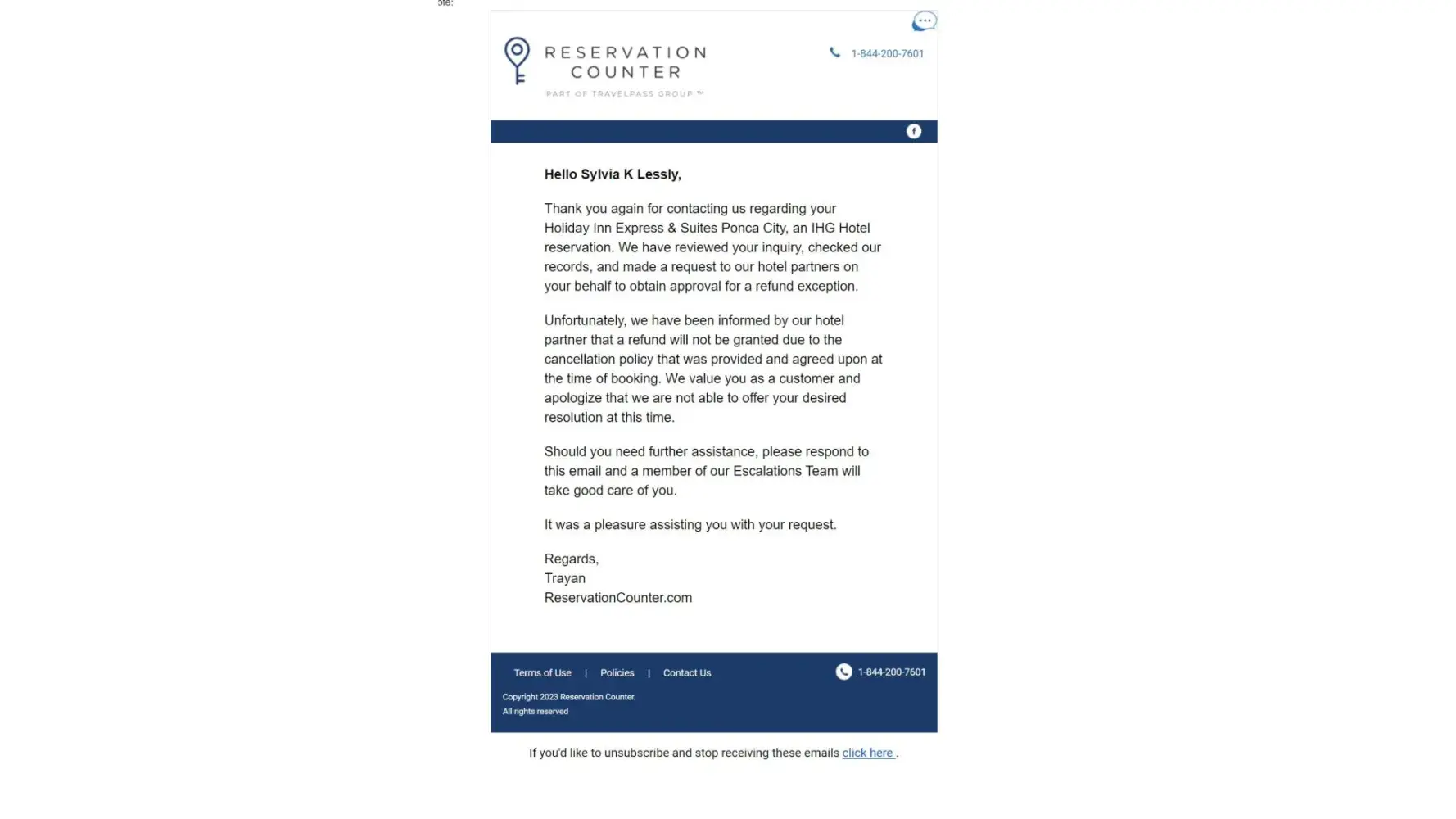 I presumed the number I called was the number of the hotel chain (America’s Best Value Inns) I wanted to stay with. The call was redirected to an 844 Area Code, with no geographic identity, often used by scammers and off-shore entities, even though Reservation Counter’s website says they are in South Jordan, Utah. The “agentâ€, with a strong foreign accent, quoted me one price. The confirmation I received stated a different (higher) price plus a $51.26 (42.65%) tax plus their $15.99 non-refundable fee. I called two days later, gave Alex(no accent) my itinerary number, Alex (no accent) looked up my reservation. His records showed entirely different room charge and taxes of $12.15 (only 13%). Asked to be transferred to Complaint Dept. Mary, in Customer Service answered; would not give me a physical address, would not give me a phone or have anyone call me. Would not email their email address or number or address. Would not transfer me to a superior. Would only give me their email address, which is m: [protected]@reservationdesk.com. I have not received a reply. She did say she would cancel my reservation. I’m not done yet. Will report back if this is resolved.