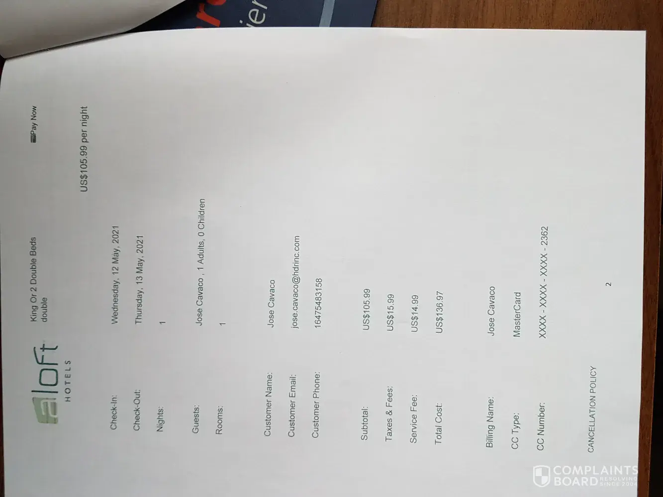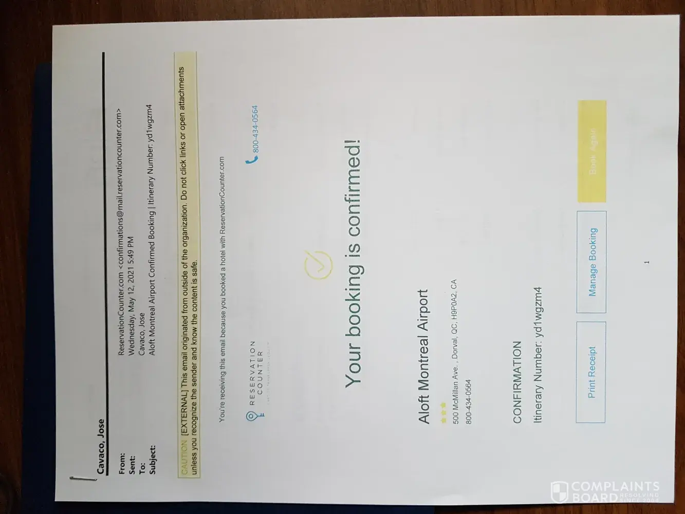 I received a confirmed booking from ReservationCounter (itinerary # yd1wgzm4) for the Aloft Hotel at the Montreal Airport for the night of May 12, 2021 (see attached confirmation letter). When I called the hotel that day from the Montreal Airport to have a shuttle pick me up I was informed that the hotel was closed and not taking any guests. A sum of $156.64 was charged to my master card although I did not stay at the hotel due to a booking that should never have been made by ReservationCounter.