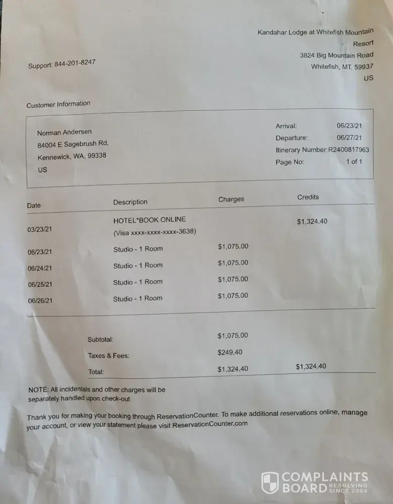 On 3/23/21 we booked a room with Kandahar Lodge at Whitefish. There was a deal of buy 3 nights, get 4th free. We believed we were dealing with the hotel itself, when somehow we had gotten transferred or referred to Reservation Counter . As we are preparing to go on our trip, we noticed that even though their invoice looks like there was some kind of credit, there really wasn't. I called on June 20, 2021 and there were no managers at Reservation Counter available until the next day. To resolve the issue, I am looking for a refund of $268, which is one nights stay. I appreciate your help. Itinerary Number R2400817963 Cynthia Andersen